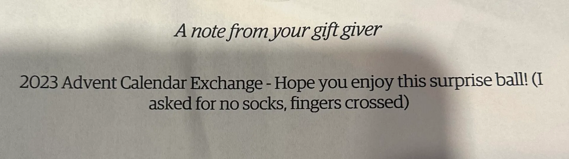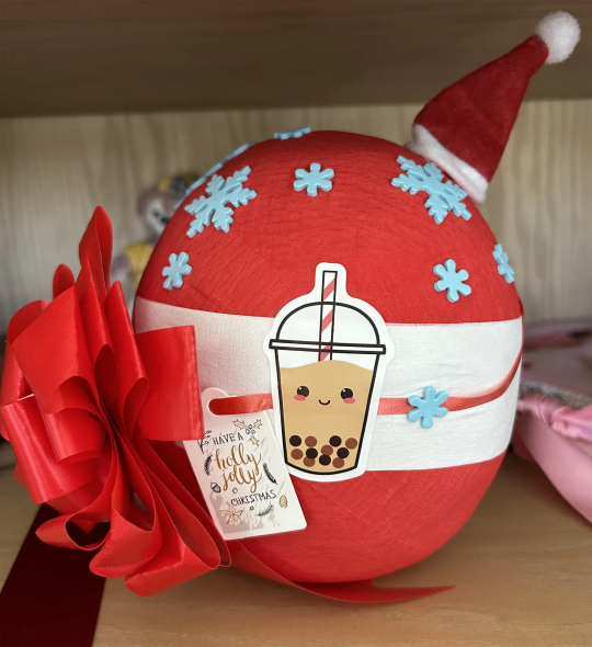 My awesome gifter sent me one of the most unique advent calendars I have ever seen. It's decorated so cutely, with a little cup of boba sticker on the outside, blue snowflakes all over the top, a giant red ribbon, a little have a jolly Christmas message attached, and an adorable Santa hat attached at the top. I'm so excited for December to arrive so I can finally start to unravel it! Thank you, so much. This is something to look forward to.