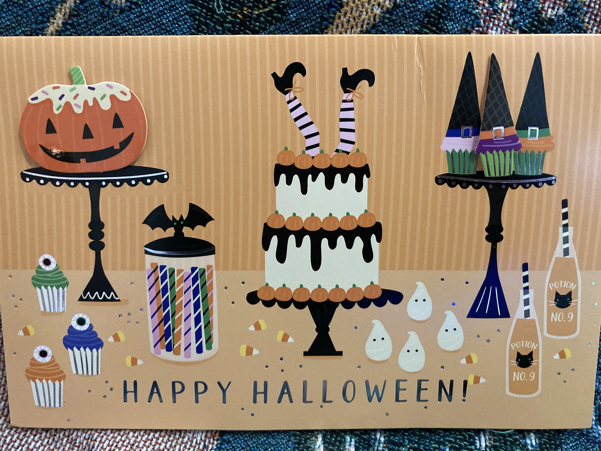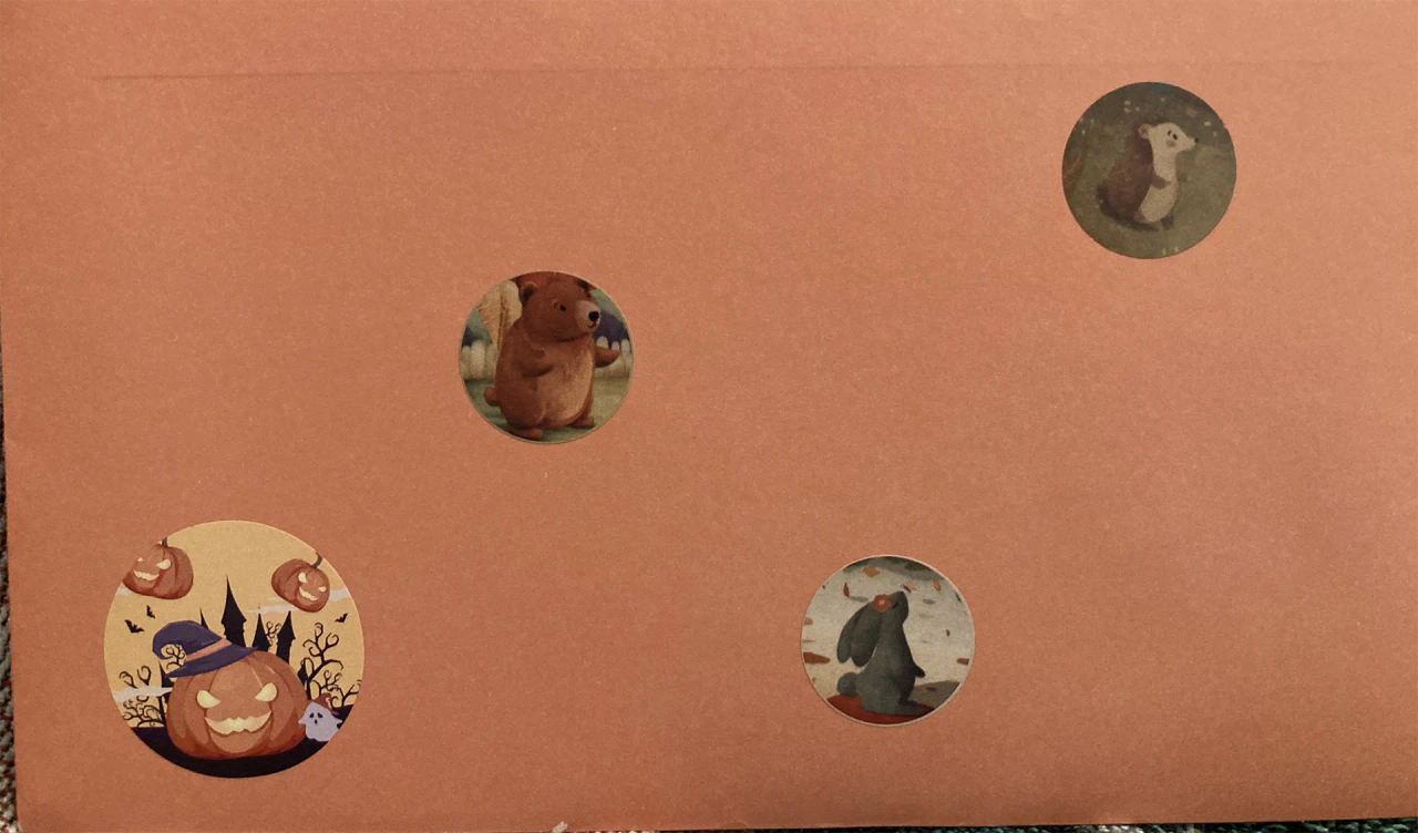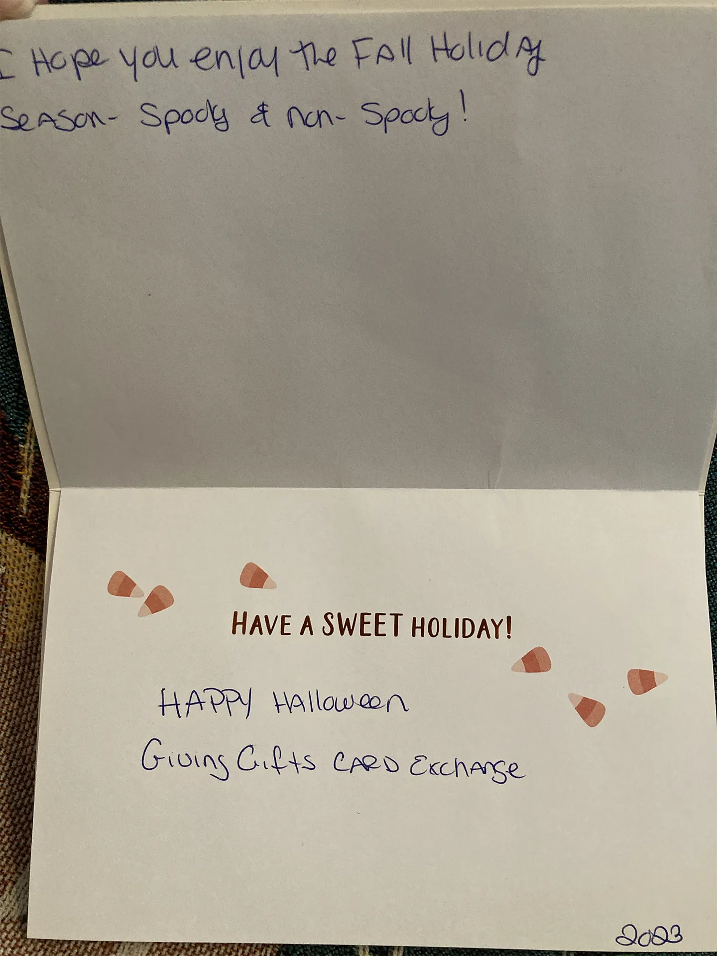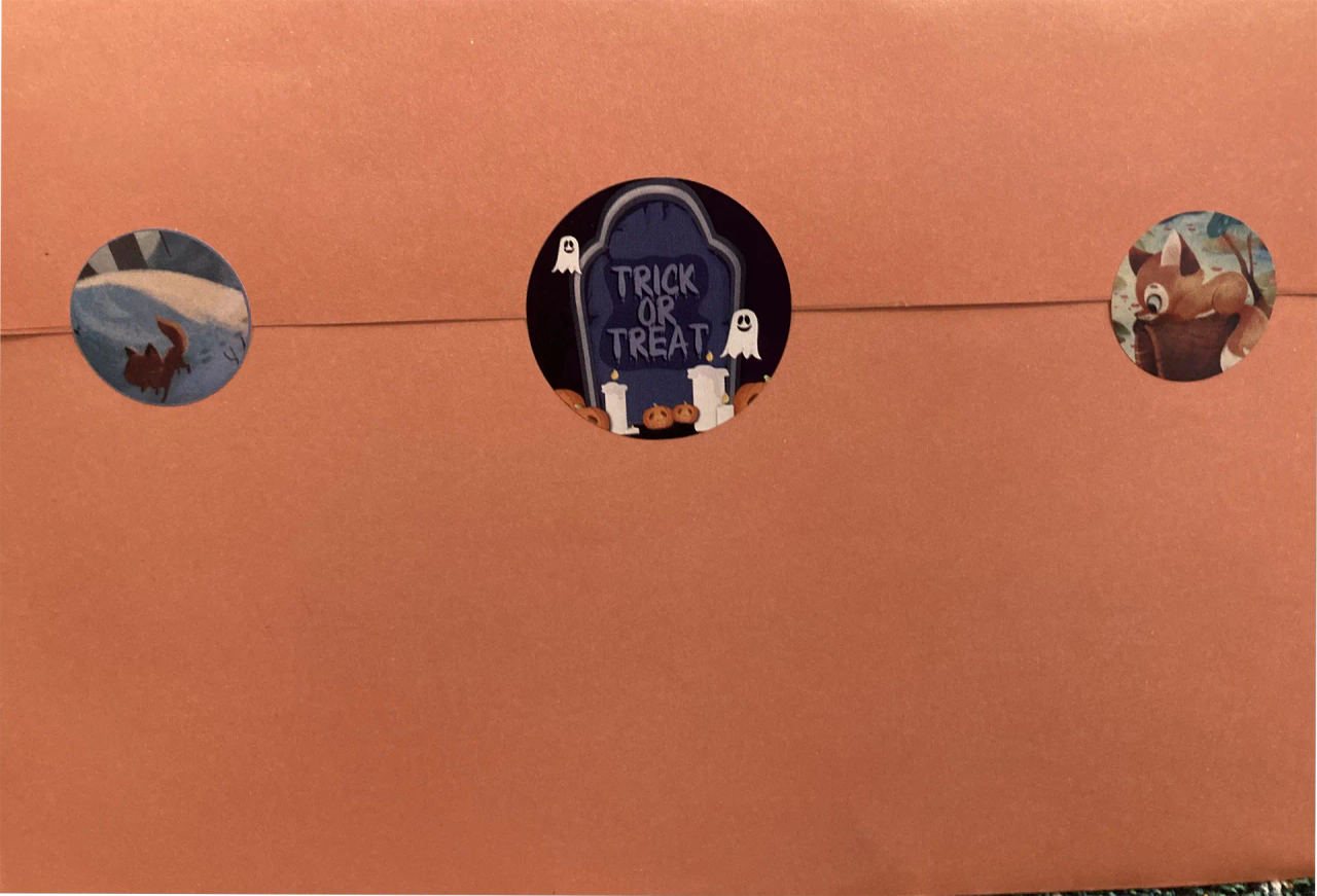 I received a very cute card decorated on the outside with stickers on the front and back. Thank you, so much! The card is really cute. I hope you have a happy Halloween!