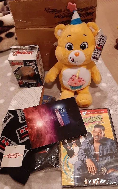 My gifter sent a wide variety of very fun items! From a Doctor Who card, to Nintendo and Star Trek socks, a Marvel themed Loki bluetooth speaker and a birthday care bear! I even got a Fresh Prince of bel air season 1 dvd though unfortunately I already own it. I'm sure I can pass it along to someone who will appreciate it, Thank you!