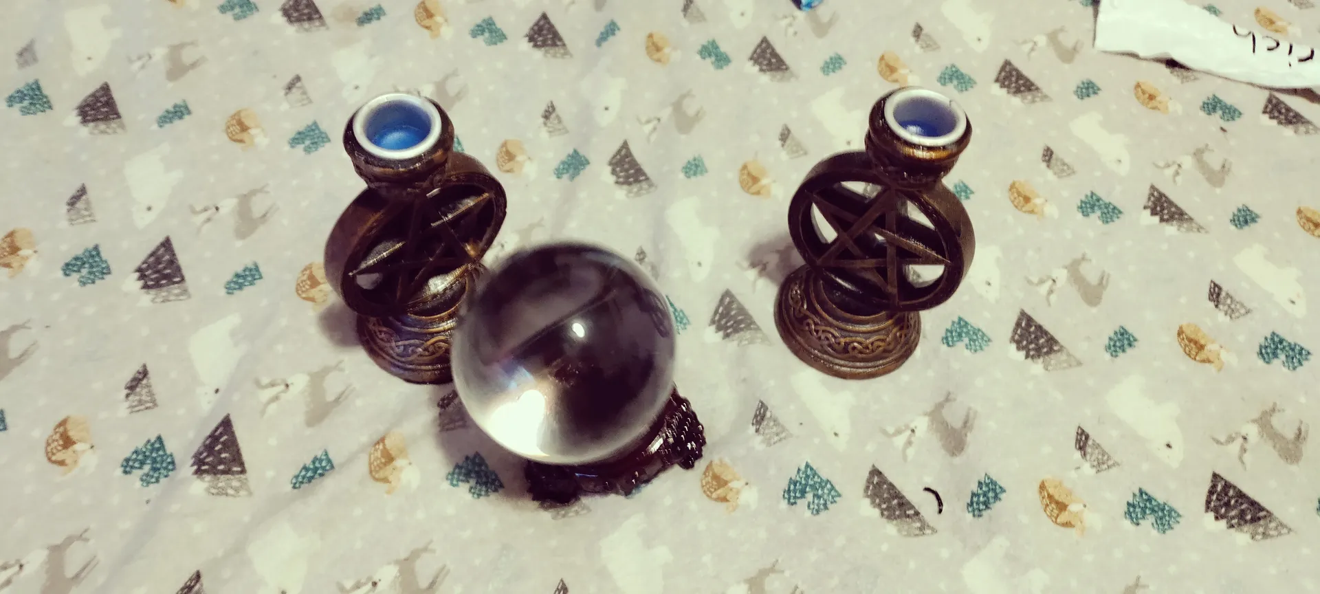 A lot of cool little pagan items, a crystal ball and some pentagram candle holders, plus a little gemstone ghost buddy