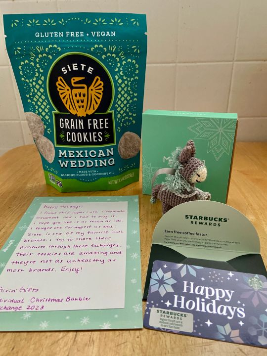 Thank you to my amazing gifter… , the ornament is super adorable, I will be keeping this around all year and they also sent some yummy treats and a Starbucks gc. I love that they were supporting local businesses too. I am overwhelmed and appreciate your kindness ?