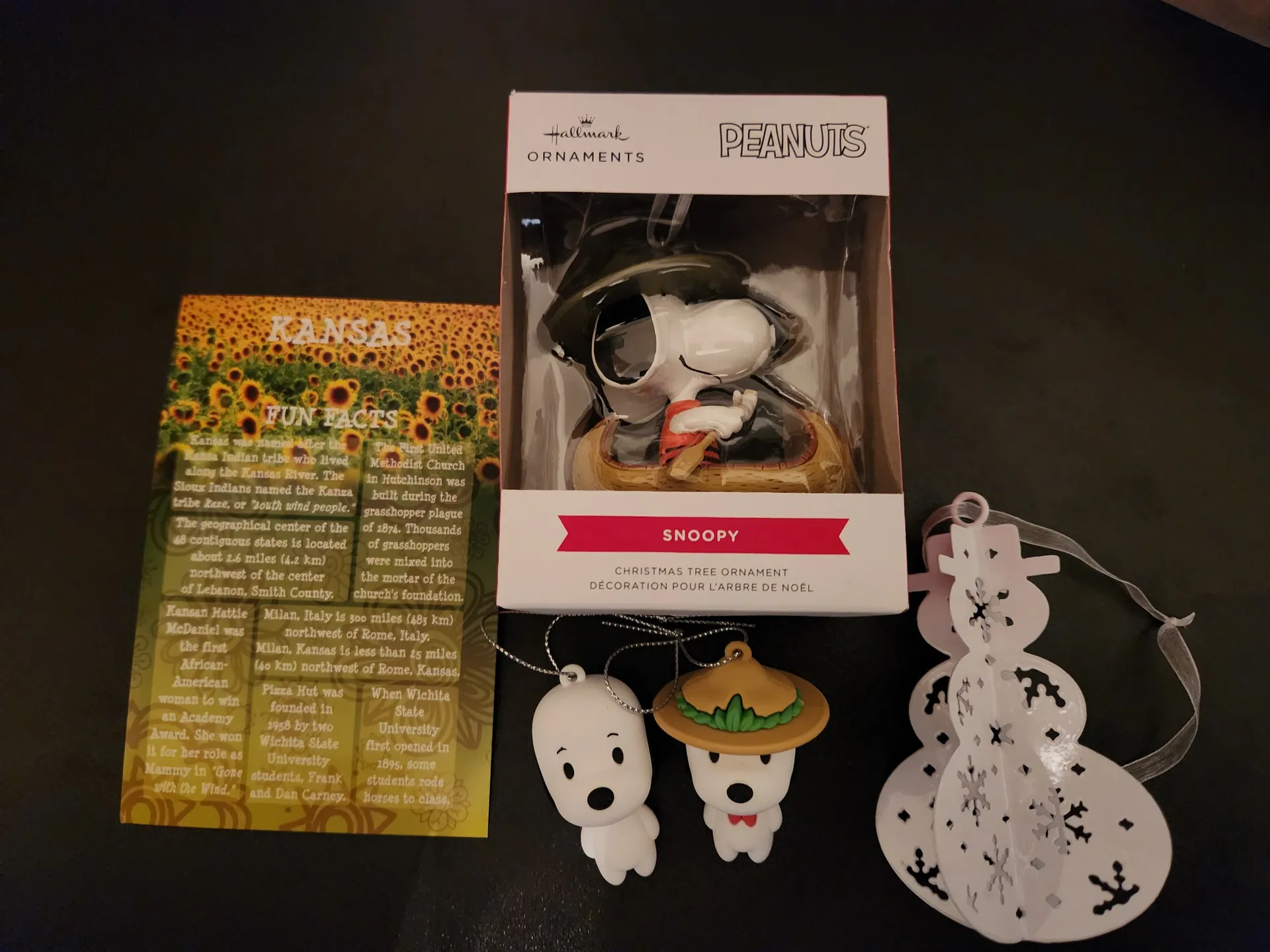 My gifter went above and beyond with this exchange! They got me 4 ornaments (3 more than the asked amount)! They saw that I love decorating this time of year and that I love using snowmen and the Peanuts to do so. I got a two snoopy mystery ornaments, an adorable snoopy paddling a kayak, and a sweet snowman to add to the tree. (Not to mention the sweet postcard with plenty of fun facts about Kansas) Thank you!