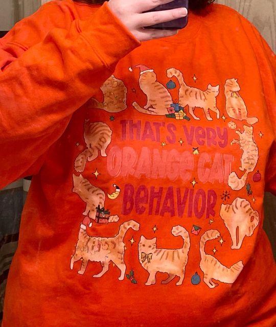 I got the BEST sweatshirt! I encouraged my gifter to find something not on the wishlist if they wanted, and they did and found something perfect! Orange cats are the best and this is absolutely hilarious. It’ll be perfect for my work holiday party too! And it’s cozy too. You did a great job figuring out my style! The colors of the text are a little wacky on the bright sweatshirt, but I think that adds to the charm! It’s orange cat chaos all around. Thank you so much, I got such a kick out of opening this package! I actually didn’t realize it was my gift, I thought it was the yarn I ordered and was so surprised to pull out this bright orange amazingness. Thank you!
