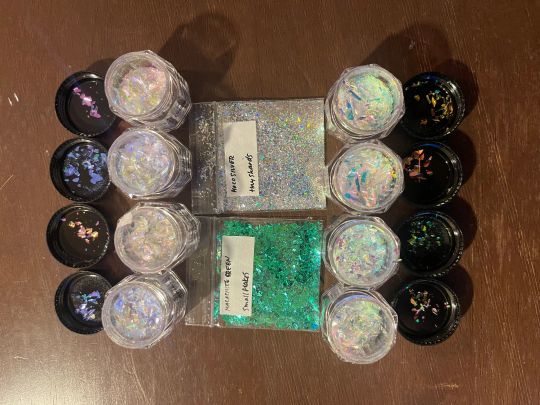 My gifter got me exactly what I’ve been wanting to up my crafting. They sent me some gorgeous glitter along with a box of 8 different colors of chameleon flakes.