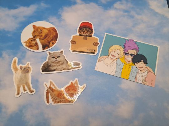 I got six ADORABLE stickers!! I love the Banana Fish one, and the cats are so funny. They will all have a very special place in my sticker book. These gifts were so perfect! Thank you so much for making my first exchange on this platform a great one.