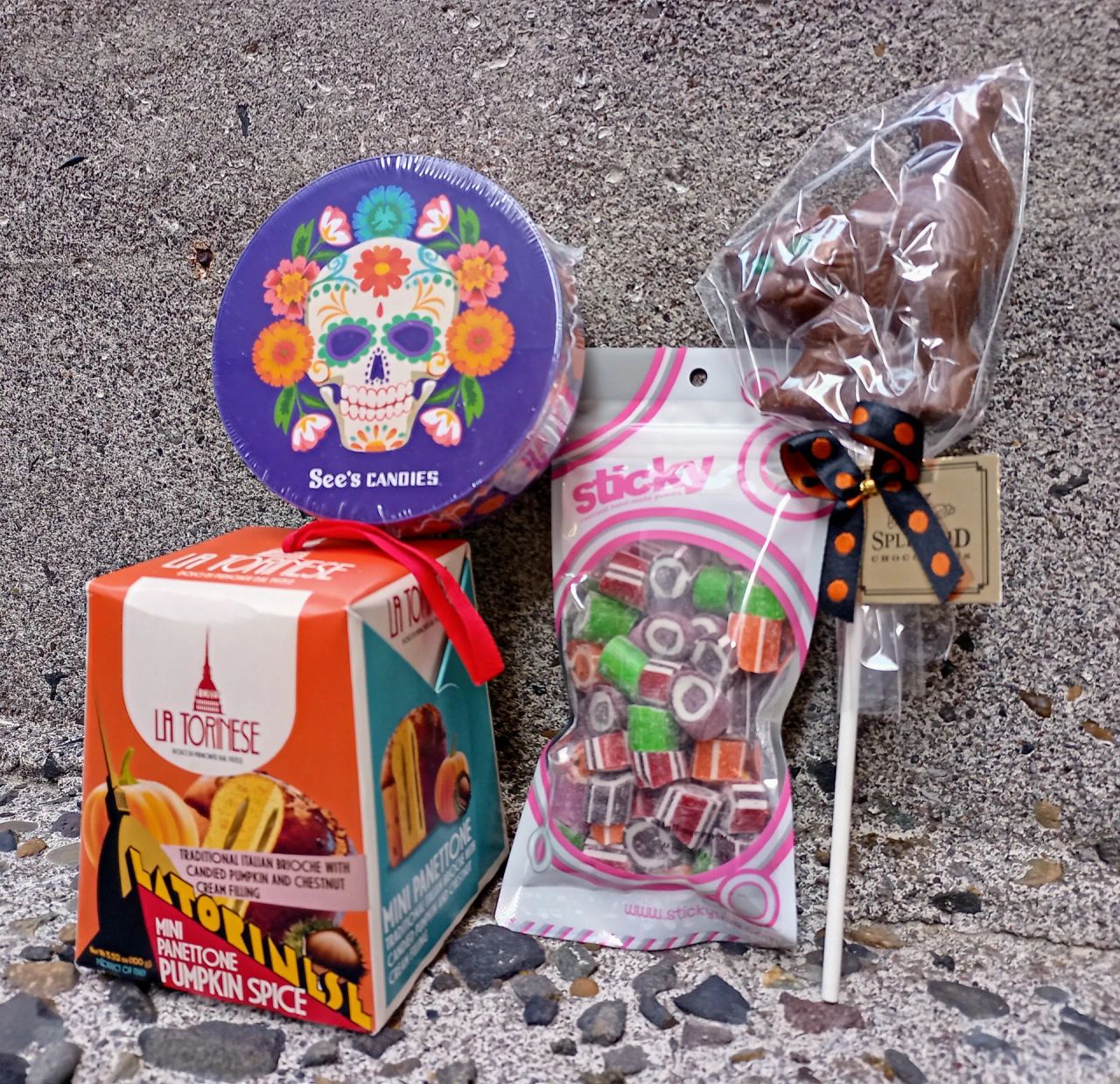 Where to begin? My "treat bag" has been well and truly stuffed! My generous and thoughtful GG gifter absolutely spoiled this exceedingly grateful giftee. My gifter included lots and lots and lots of wonderful and tasty milk and dark chocolate (both new to me and seasonal favorites), a personally recommended hard candy, a seasonal panettone and a handcrafted card with a neighborly note all tucked into a swath of seasonal fabric. Did I mention the Amazon gift card?! I used that to purchase the boxes of salty cheesy crackers as a suitable foil to all the sugary treats plus a sweet-smelling candle for the upcoming winter holidays. A once-in-a-lifetime Halloween goodie box... Happy, happy, joy, joy!