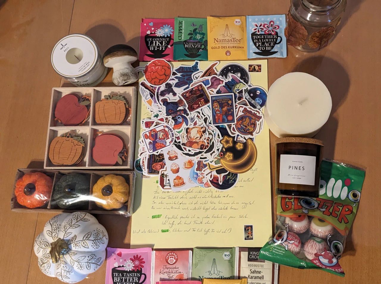 My wonderful gifter made me a collection of different autumn themed decorations, scented candles and collection of different tea which made the package smell amazing! Also, they added my favourite treat. Unfortunately one of the candles were damaged but I can probably just put it on a plate or melt it to put in a different container. The handwritten note was lovely as well and showed that they really thought about the gift. Thanks a bunch :)