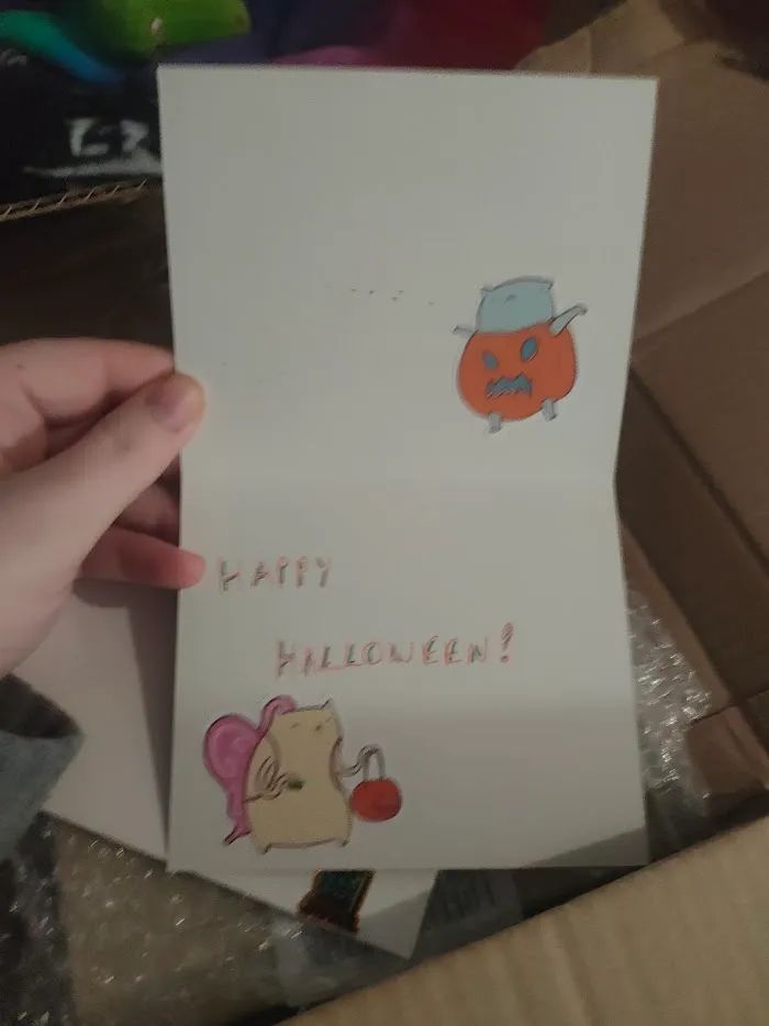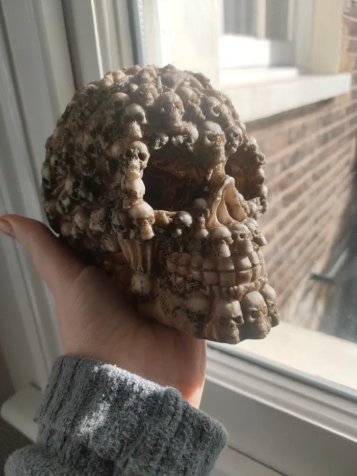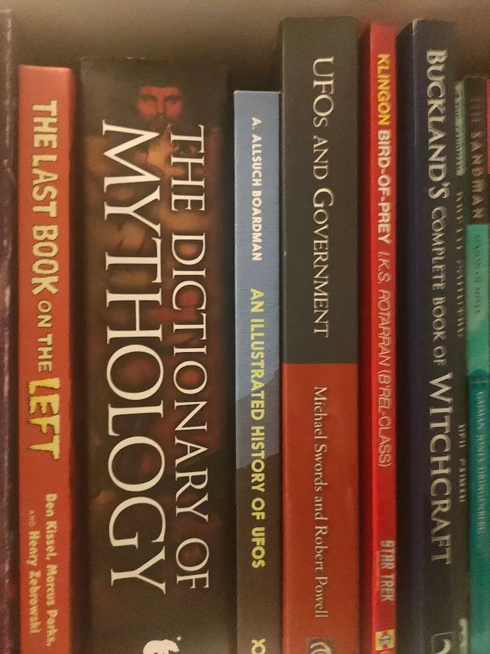 My Santa totally blew this one out of the park. I got a beautiful card, and some very yummy candy (that went quick!) I collect skulls and I think that this is currently my crowning jewel. It's skull-ception! Isn't it beautiful? I also got a really cool book on UFOs that I have actually been wanting for a while. I'm still reading it, but I took a picture of it nestled next to my other books just so you can appreciate how into this I am. This was an absolutely amazing way to celebrate Halloween. Thank you SO MUCH!