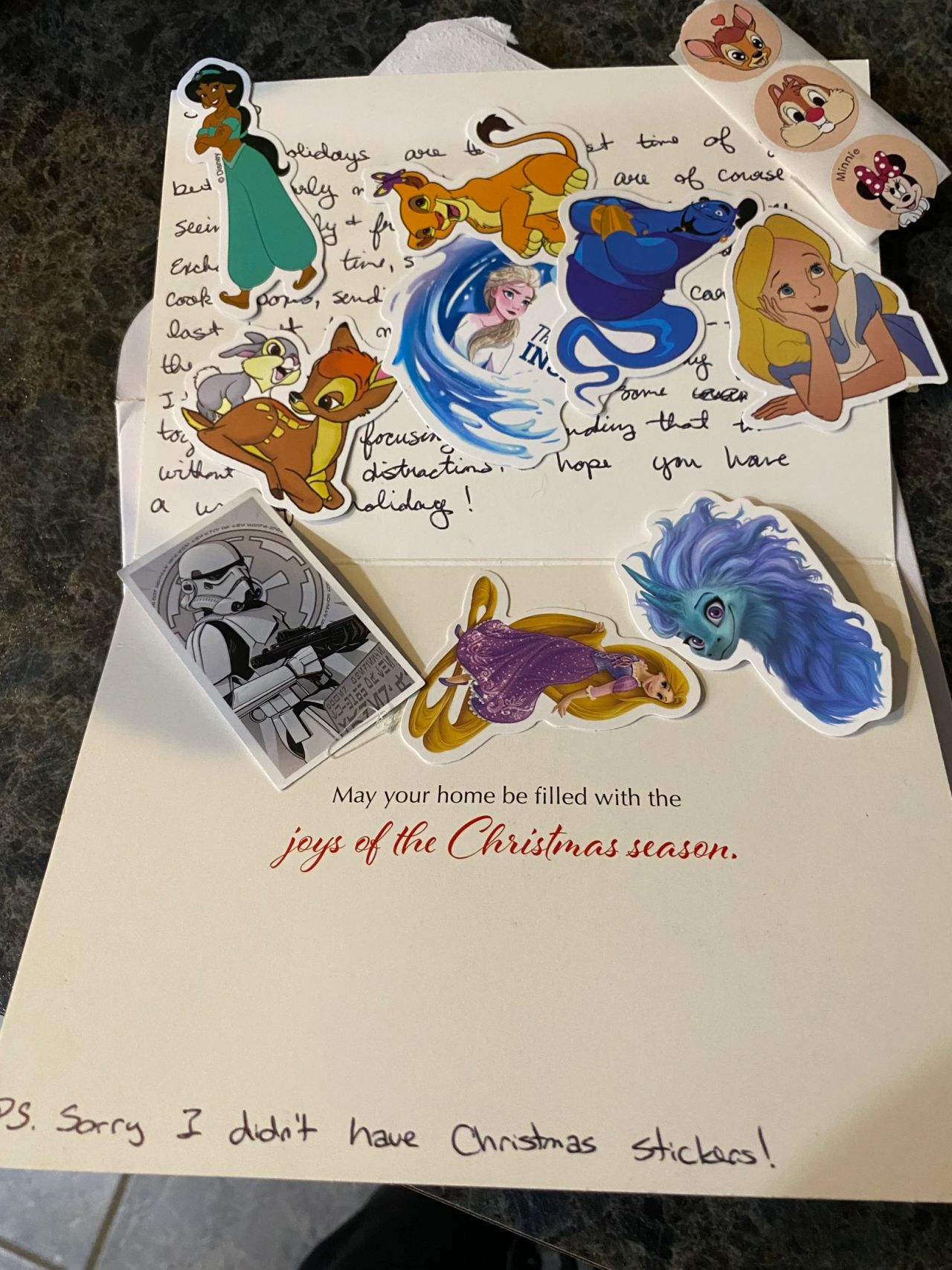 I got the prettiest Christmas card with the sweetest “bucket list” note. Now I’m inspired to make cookie boxes! The stickers were a nice touch. Alice stood out to my son, who is in Alice in Wonderland, opening tonight. Thank you!
