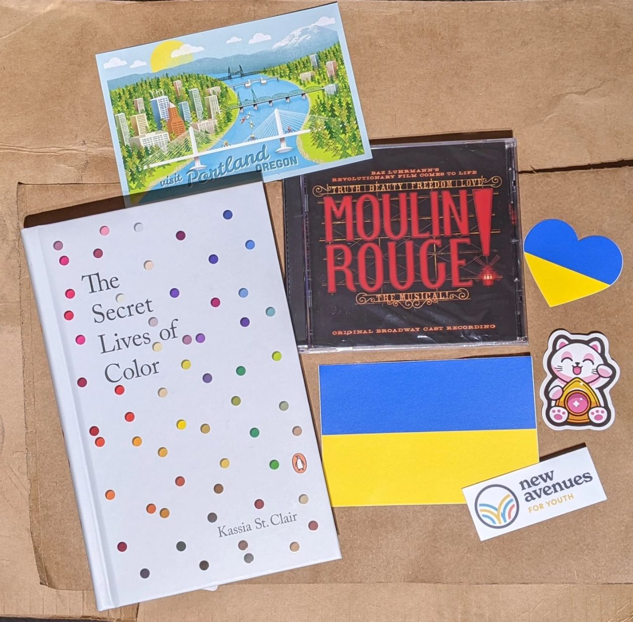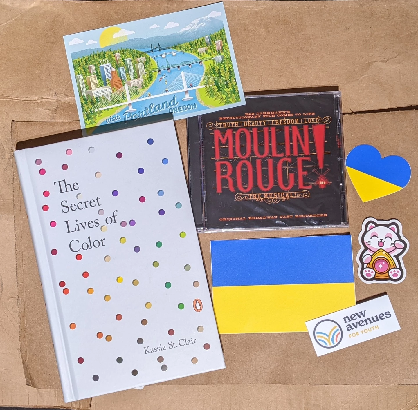 Thank you, Rematch Gifter!! This book, The Secret Lives of Color, is so fun!! Each color has a story behind it, when/where it came from, what made it famous... I love this so much! And thank you also for the postcard & stickers you sent, my favorite colors happen to be a flag that represents a country that really needs our support right now, great idea. Thank you also for the Moulin Rouge soundtrack, it was great to connect with you over musicals! Thank you so much for being a rematch Gifter, I so appreciate it! Edit: I just got another box, and it is full of colorful snacks! Omg, you have spoiled me. Thank you!