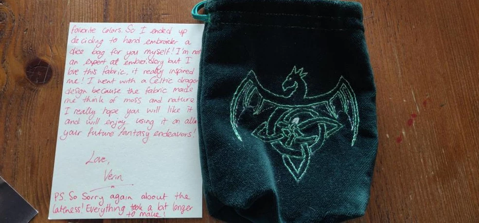 Turns out the person that send me a gift was also the one who i gifted for this exchange! We had a cool conversation about all the hand crafted stuff she makes for other people in these kinds of exchanges and i became one of the people to recieve something handmade! It's a dice bag so i can easily take all my dice with me for D&D! I absolutely love it!
