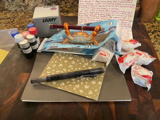 What a fantastic gift. You were so thoughtful when you put it all together. And how did you know the coconut ferrero rochets are my favorite? (Rafaellos I think?) My little crab friend Jiffy has a nice spot on my desk now. I look forward to using the ink samples, paper, and, of course, the pens! Thank you again for going above and beyond! Happy Holidays!
