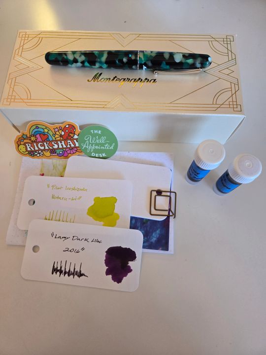 Photos truly do not do this pen justice - the green in the body is so vibrant. I have a few other green pens in varying shades but nothing quite like this but it checks all my boxes. Nib was cleaned and quickly inked and it writes so smoothly. I also got a few samples included the infamous 2016 Lamy Dark Lilac that I can't wait to ink up... or horde. The stickers and extra swatch cards are also a welcome surprise that came with my note. Thank you Santa!