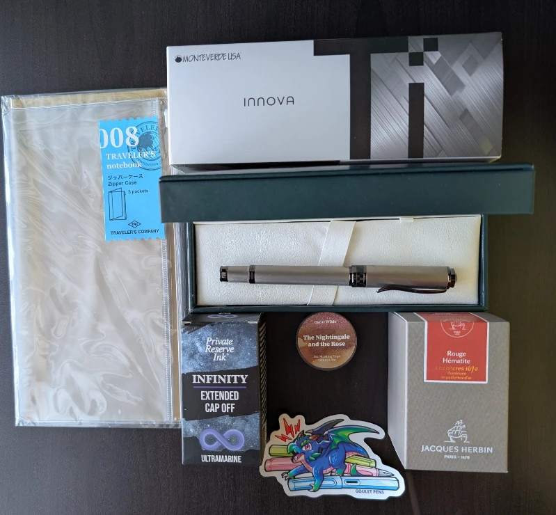 It's an amazing gift and I really appreciate that my Secret Santa has gotten me not only brands that I don't already in my (rather extensive) collection but are also unusual. The titanium nib on the Monteverde Innova is one that I absolutely do not have and cannot wait to use when I switch out my pens after the holidays.