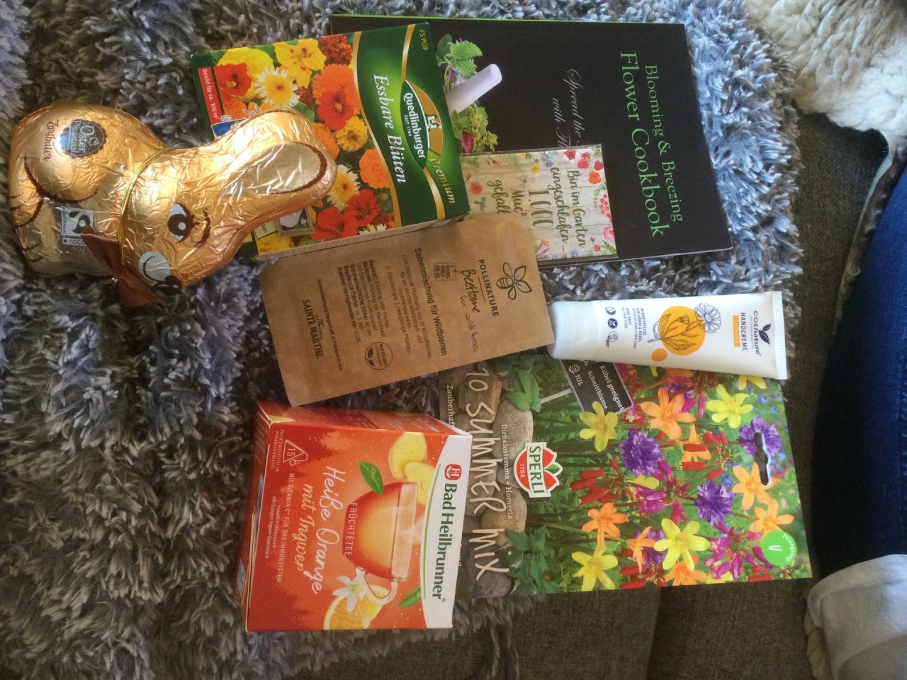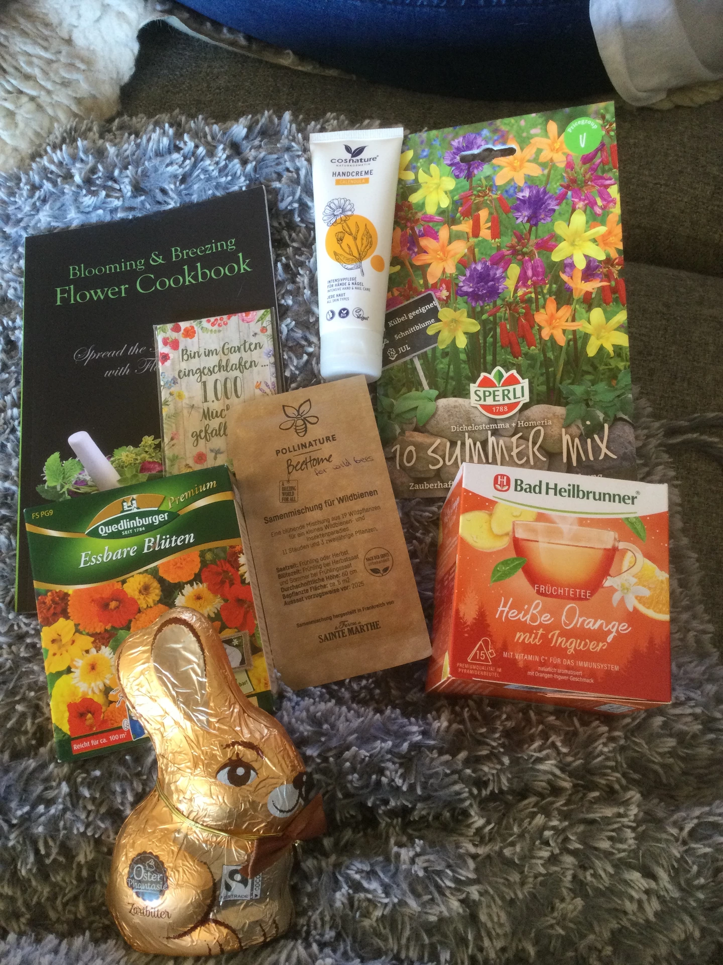 Thank you so much for the great gift that I am very happy about. The cookbook with recipes where flowers have been used is exciting and I look forward to grow the edible flowers. And thank you for chocolate, tea, seeds and bulbs but especially the hand cream, because I always buy calendula cream when I am in Germany, which I have not been the last two years due to covid