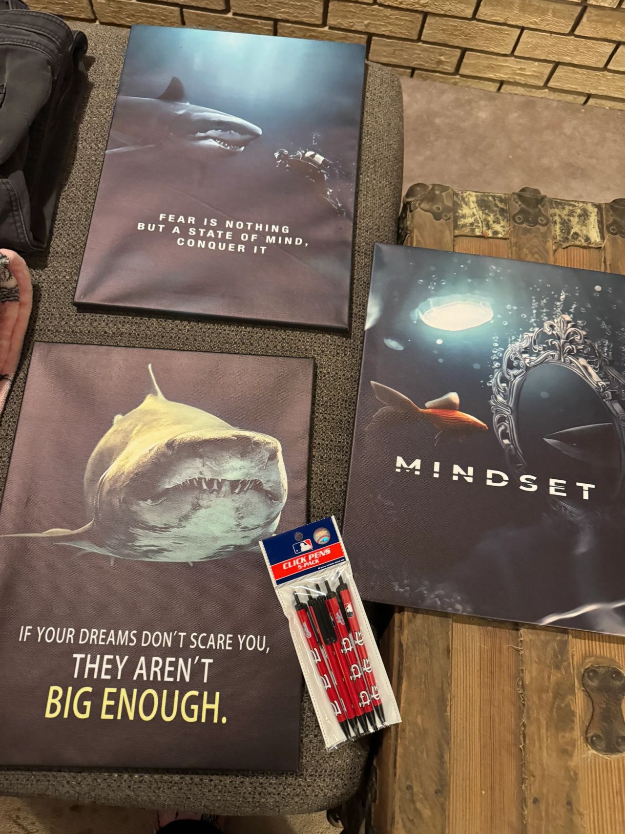 I received some really adorable shark items for my shark themed bathroom - a few canvas posters and hand towels. I also received Cardinals pens!