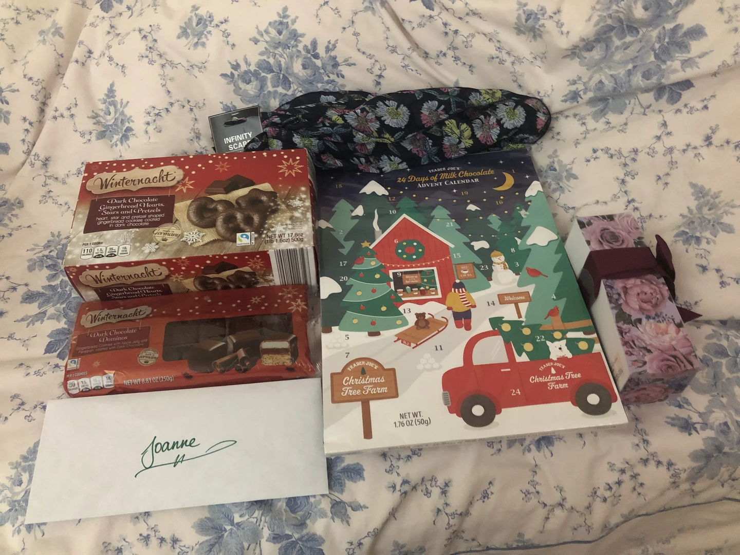 Santa really went all out - two types of chocolate, a chocolate Advent calendar from Trader Joes, a lovely infinity scarf (perfect for when I need to go to the office), a lovely (and I can't bear to write on it!) stationery, and a kind note. I can't wait to open the chocolate up and try it!