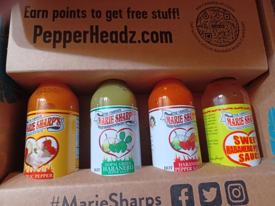 The box included 4 full sized bottles of different Marie Sharp sauces, and some small little portable packets as well. Very happy with this :)