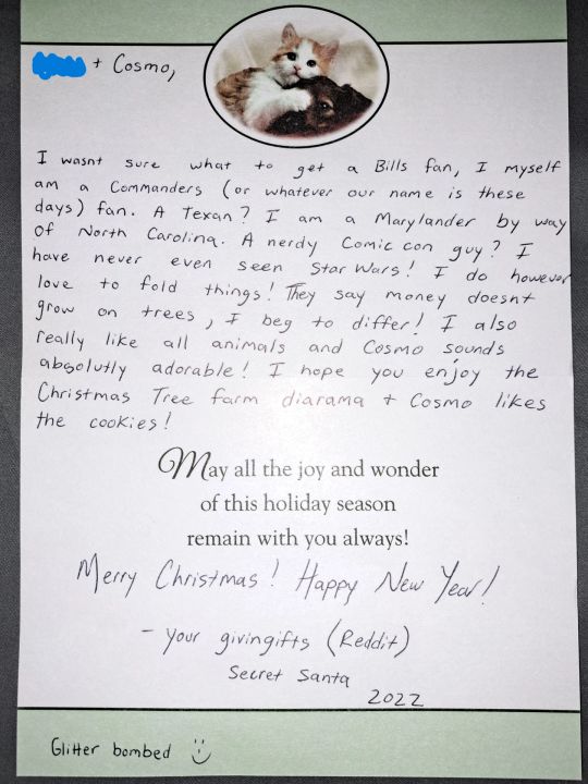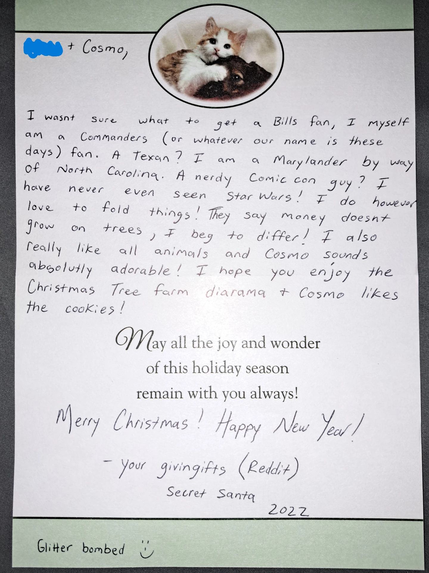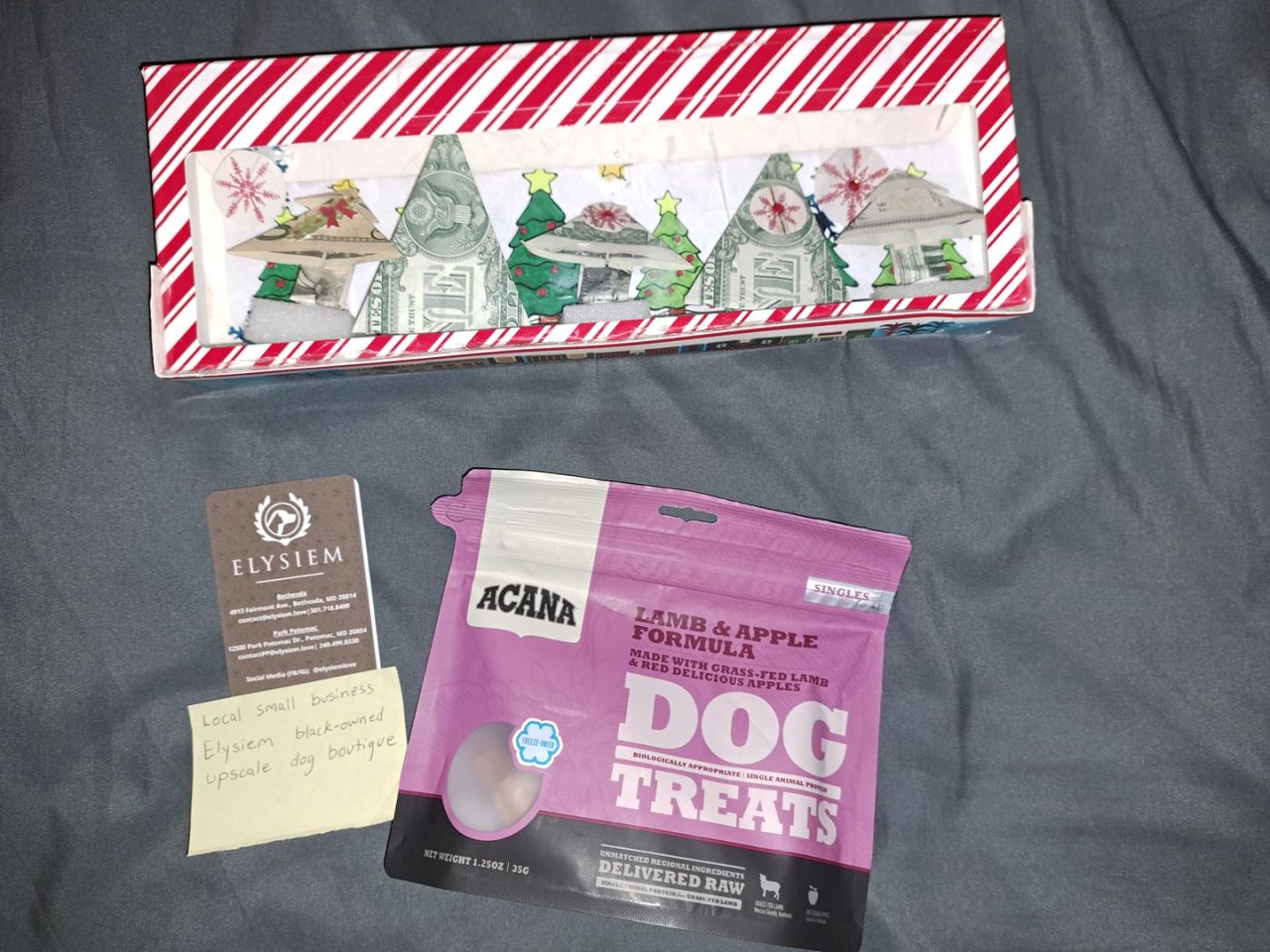 I got home from a long first work day back at the office after the Thanksgiving holiday to find my gift has already been delivered. Secret Santa thought about both my pup (Cosmo) and me. They sent some treats for Cosmo and a diorama of Christmas trees folded out of money. I absolutely loved it! Oh and I got glitterbombed. But it wasn't a huge mess or annoying to clean up. Lol, thank you so much to my Secret Santa!!!