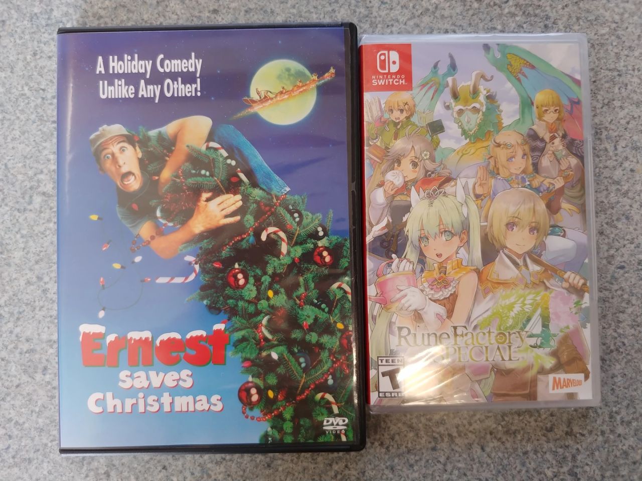 Thank you so much for the amazing gifts, gifter! I absolutely love everything. I'm always looking to add to my hoard of holiday movies, and I grew up on Ernest so I was extremely happy to add him to the collection. As if that weren't good enough, my gifter was generous enough to send me a new switch game as well. I've never played the Rune Factory games, but I'm so excited to try it out. Its exactly my type of game. Lots of gratitude for the amazingly thoughtful gifts.