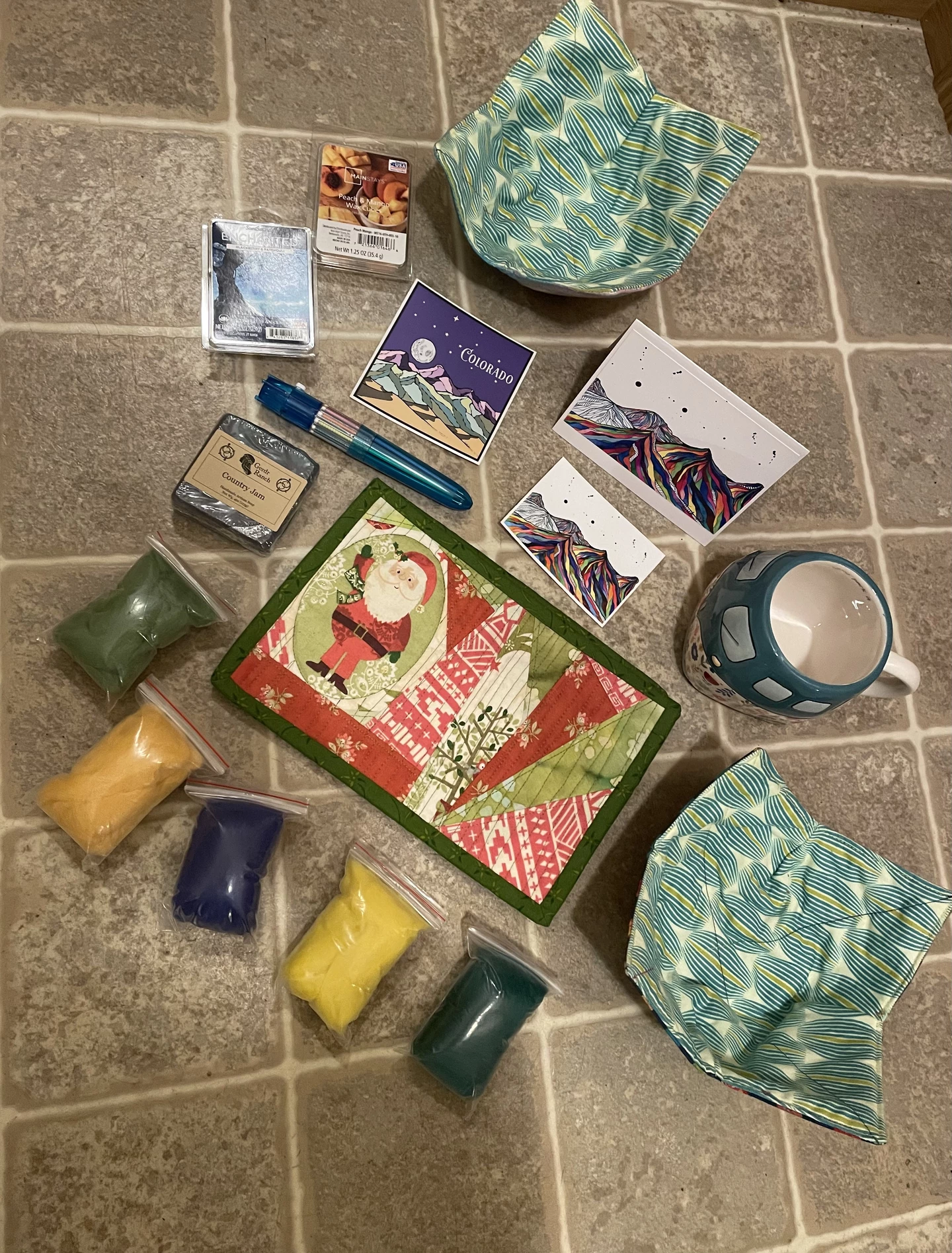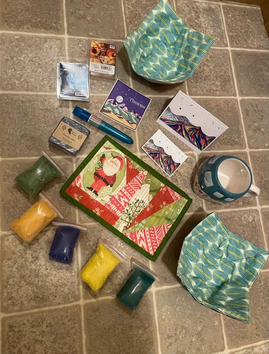 I sincerely apologize for posting this so late. I have been dealing with the unexpected death of my mother and have unable to get home to retrieve my package until now. This package was so sweet! My Santa included a beautiful handwritten card and two stickers with her own artwork. They are gorgeous! She also sent the most adorable coffee mug that looks like a little hippy camper van, handmade artisan soap that smells incredible, two packages of wax melts, roving wool for me to work on my needle felting, two adorable Santa hot pads, two bowl cozies she made herself, and one of those pens that has tons of different colors you can use(this one really brought me back to childhood. I loved these as a kid so that’s really fun!) I really appreciate everything. This was a bit of fun for me in an incredibly difficult time of my life so you have no idea how much it meant. Thank you so much!