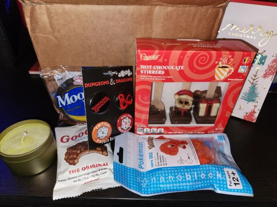 My gifter got me a pretty sweet array of treats and other items. There's a charmander that I get to build, some D&D buttons, and a handmade citrus-scented candle. Thank you!