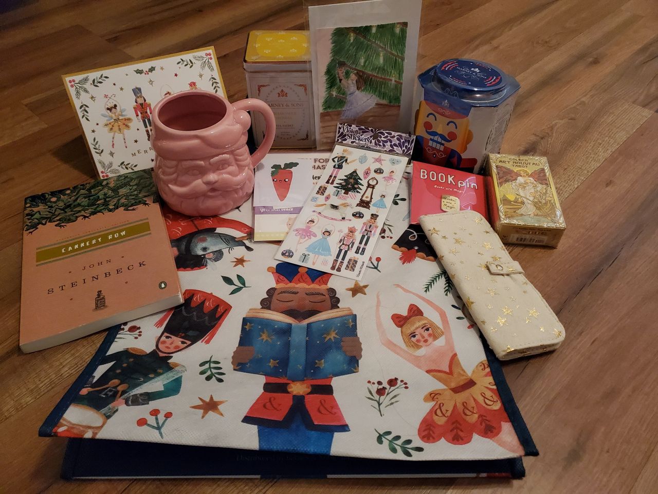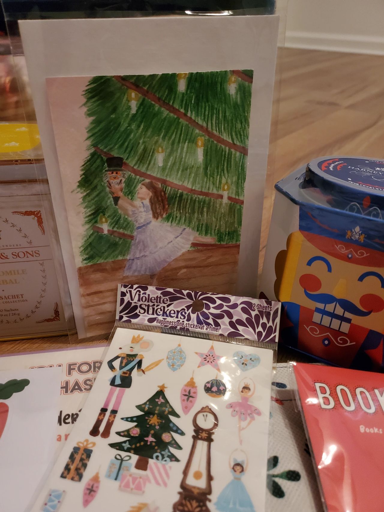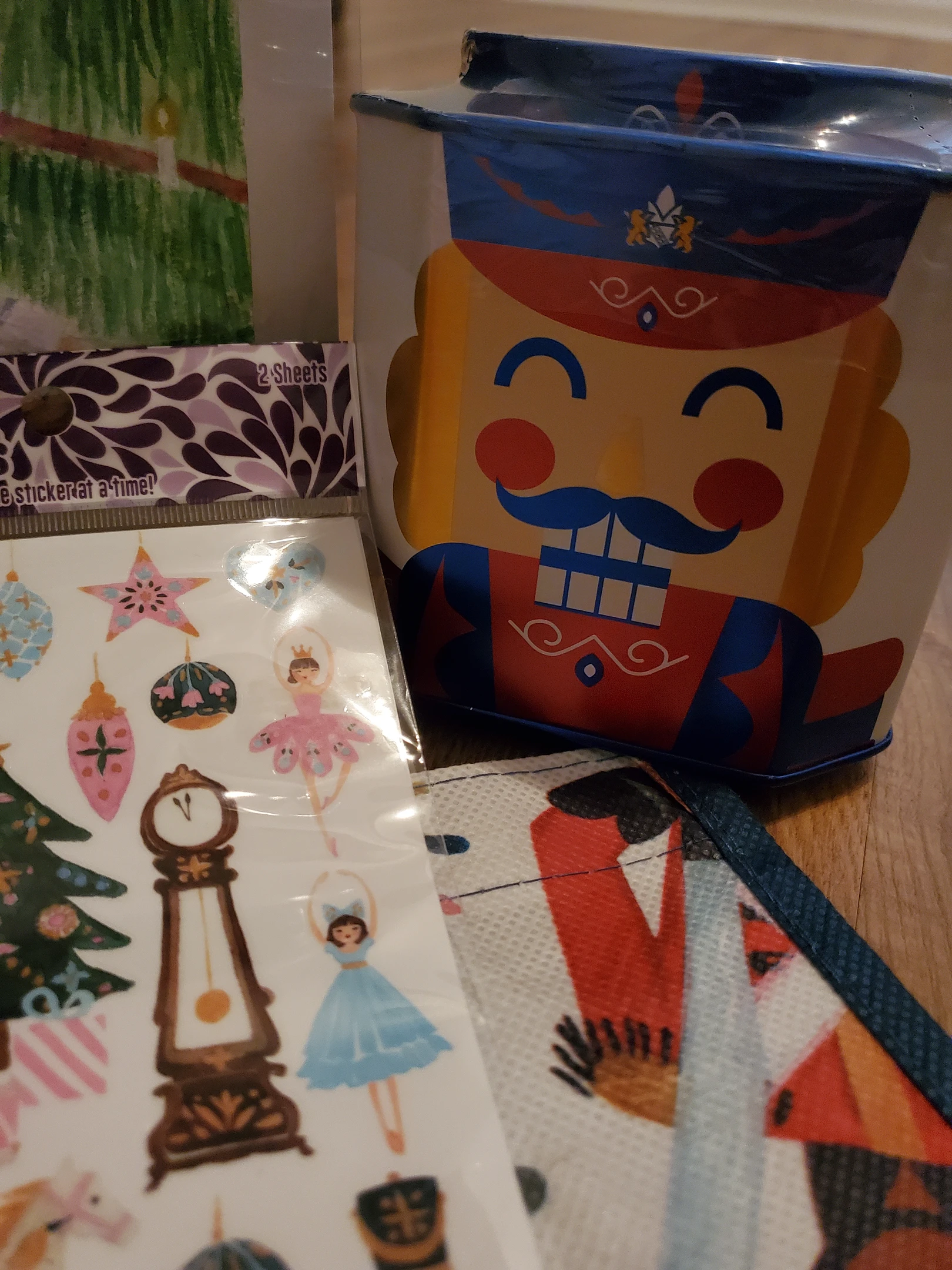 This is one of the best gift packages I have ever recieved. I am so thrilled that my gifter was also a fan of The Nutcracker and sent so many nutcracker themed gifts. It is my favorite, and all of the gifts brought me so much joy. I espcially loved the hand-painted picture of Clara dancing with the nutcracker doll in from of the gorgeous Christmas tree. I've already used the amazing nutcracker bag, and the stickers are adorable!