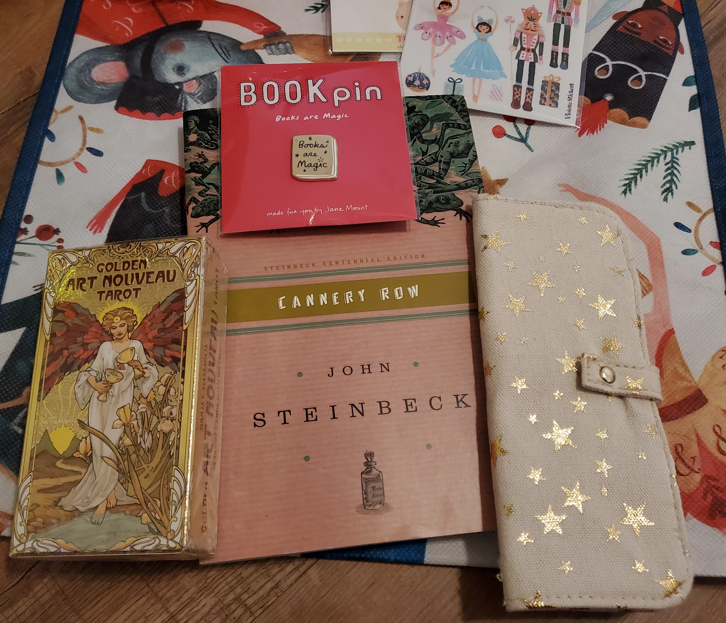 They also sent me a copy of Canery Row because I love John Steinbeck and they live not too far. I love the novel, and I think it is a sign that it is time to read it again. I also recieved a lovely box of Art Nouveau tarot cards, a magical book pin, and a cute litte carrot sticker, which I love.