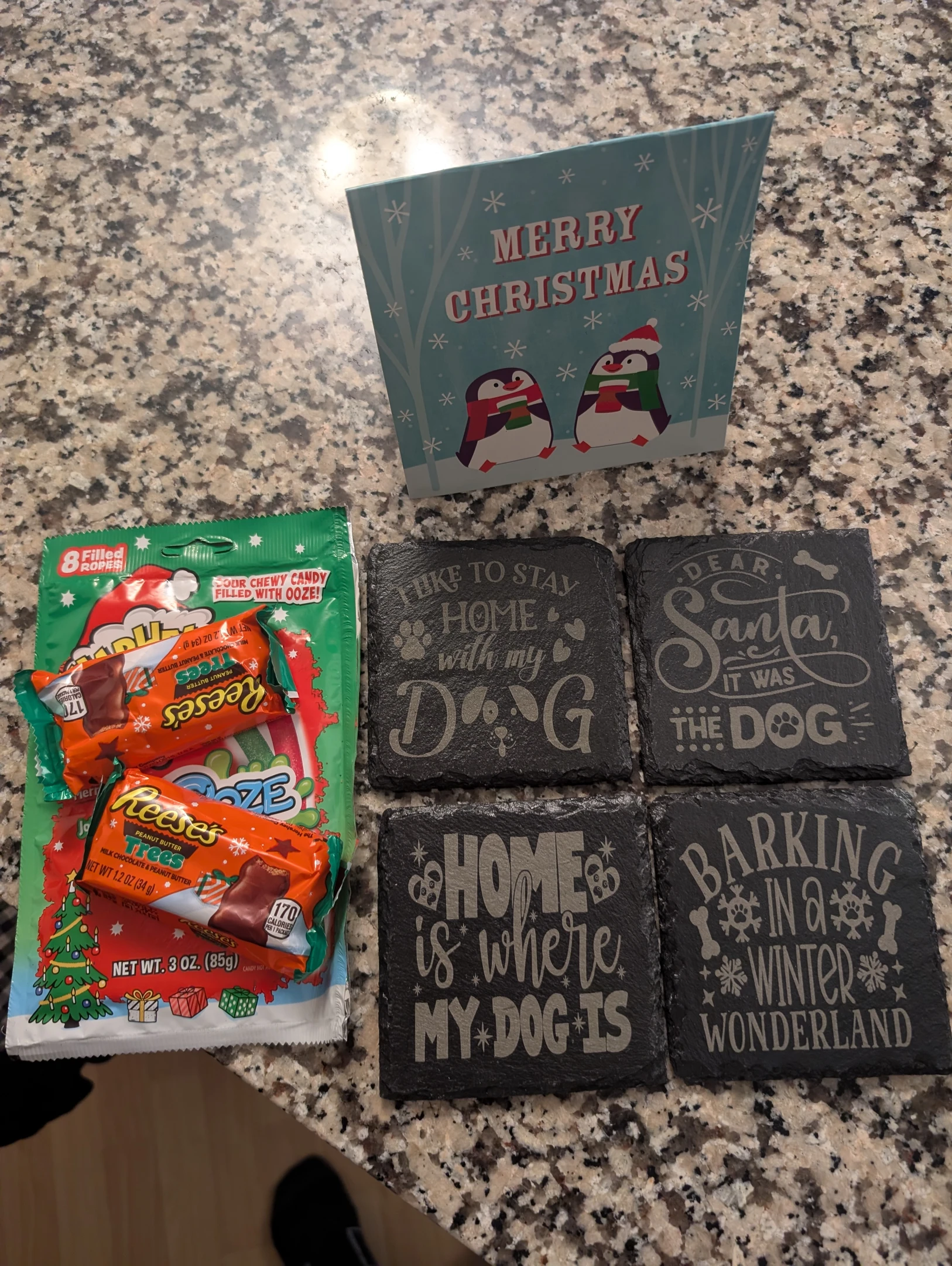 My amazing Secret Santa got me these holiday/dog themed coasters! AND some fun treats as a bonus! Thank you so much, Santa!