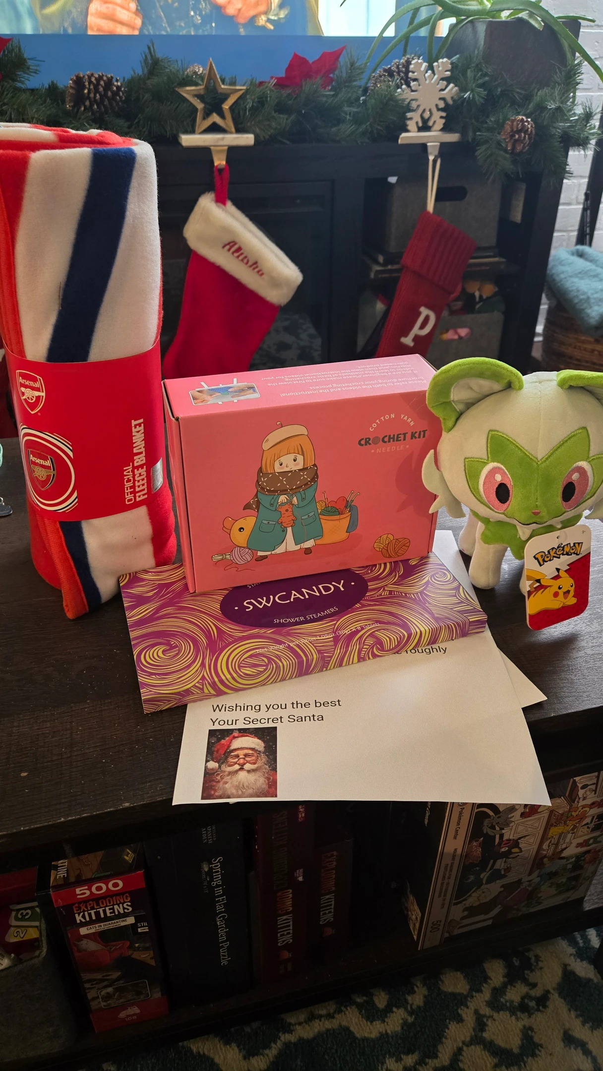 Thank you so much to my Santa for sending these amazing gifts! I'm excited to try out the crochet kit, I don't have a Sprigatito so she will go great with my other Pokemon plushes, the Arsenal blanket will be perfect for early morning matches, and the shower steamers smell so good. You did a great job picking out a variety of stuff I love!