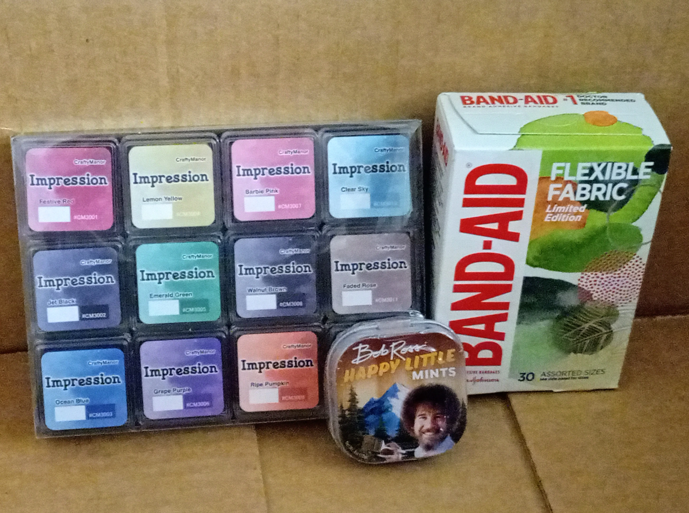 Thank you so very much for the box of goodies straight from my wishlist, GG gifter. My gifter chose five different snacks, coffee and sweetener, a set of smudge ink pads, "arty" mints, and forest bandages. This giftee is chuffed to bits and bits. Happy, happy, joy, joy!