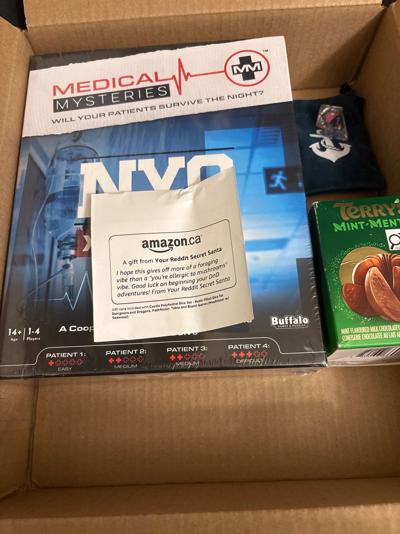 Man, I love this so much, thank you for the wonderful gifts, Santa. Been craving mint chocolate and the game will definitely be a fun way to unwinds after some twelve hour shifts. As for the dice, they’re so cute but your message is cuter, ah! I love this <3