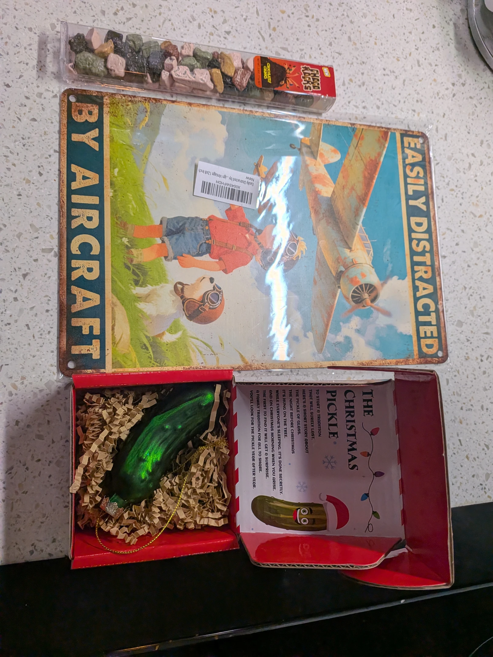 My gifter sent me a personal tradition of their family with the Christmas pickle. That is awesome and much appreciated. The sign is perfect and who doesn't like chocolate. Thanks and Happy Holidays!