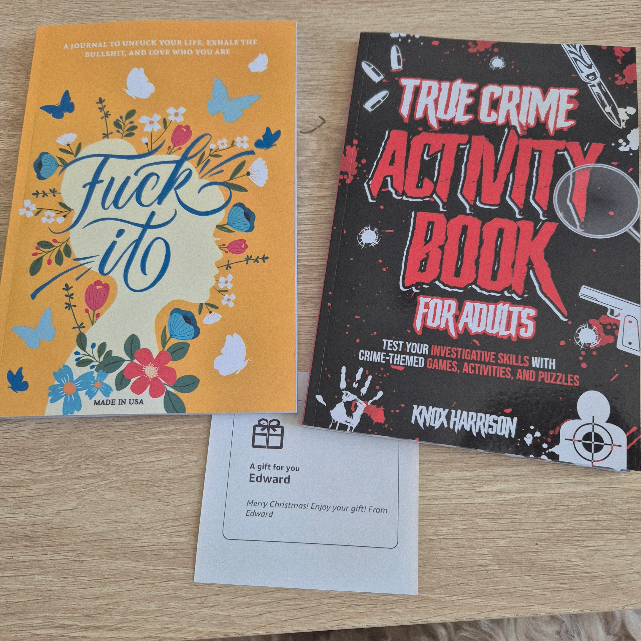 A crime activity book + a not so serious gratitude book. I just spent some time in Mental Health and it was lovely to come to these gifts and will keep me busy whole I'm adjusting to home life. Very thankful! Thank you Edward!