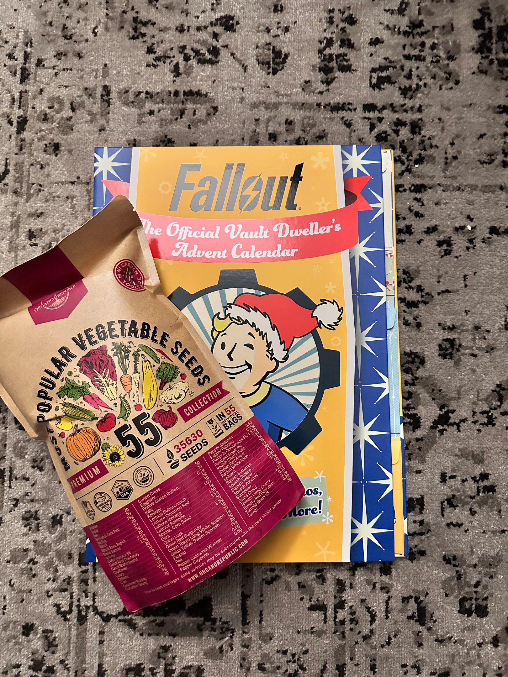 Love the Fallout advent calendar, fallout coffee (not pictured because it was the first thing I packed for moving), and seed kit (perfect as I just built a new garden bed)!!!!
