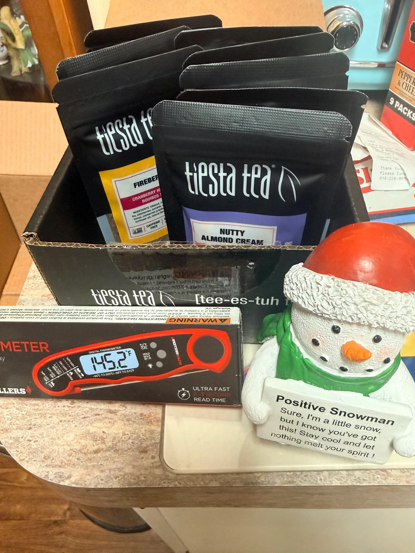 My Secret Santa did me good. I love my positive snowman. I can’t wait to try the teas and I love the meat thermometer!!! Thank you Santa!