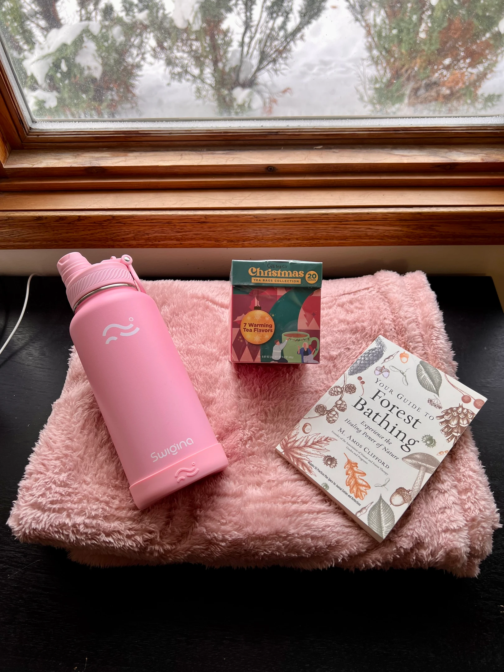 When I opened the packages my gifter sent, I was filled with gratitude. Everything reflects me so well. I can’t wait to read and use the Forest Bathing book, along with the water bottle. I have been going on walks in nature to help bring a centered calm feeling, so this book is amazing! And the soft blanket and tea will help to get some relaxation time. Thank you so much!!!!!