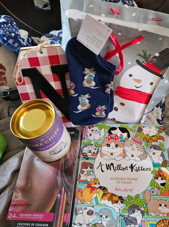 I was up earlier than usual and saw that my package was dropped off. It was perfect timing. I love the cats coloring book and pencils and can't wait to dive in! Also, thank you for the cute socks, the chips, adorable N hanging block, and the candy (temprorarily frozen) inside the bag. Thank you for cheering up and making my Christmas less blue!