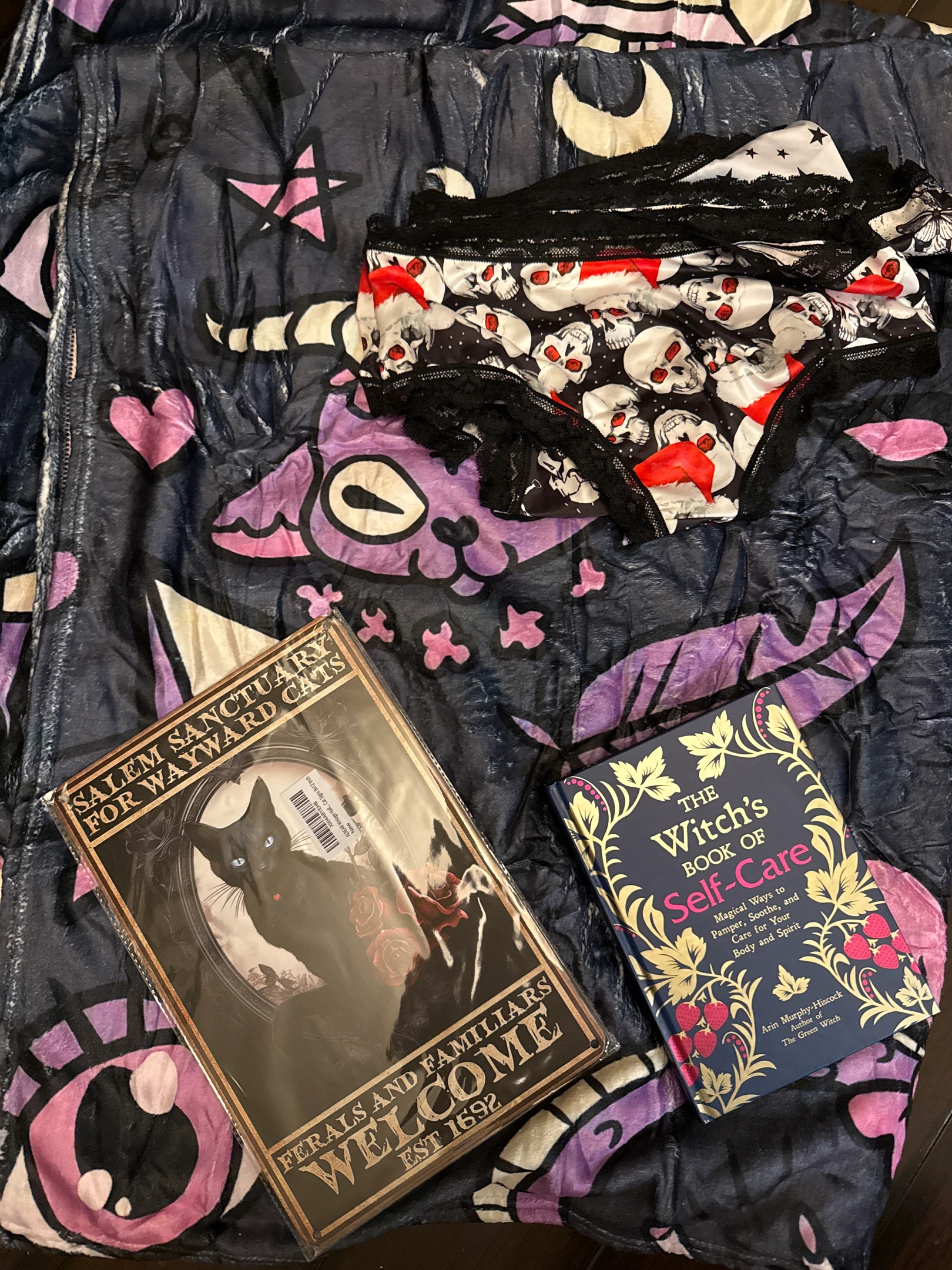 Thank you so much Santa for the sign for my sanctuary. A self care book (much needed!!!), some panties, and a lovely new blanket for my naked girls. I can’t wait to wash it and get it on the couch :) nothing makes them happier than a warm blanket