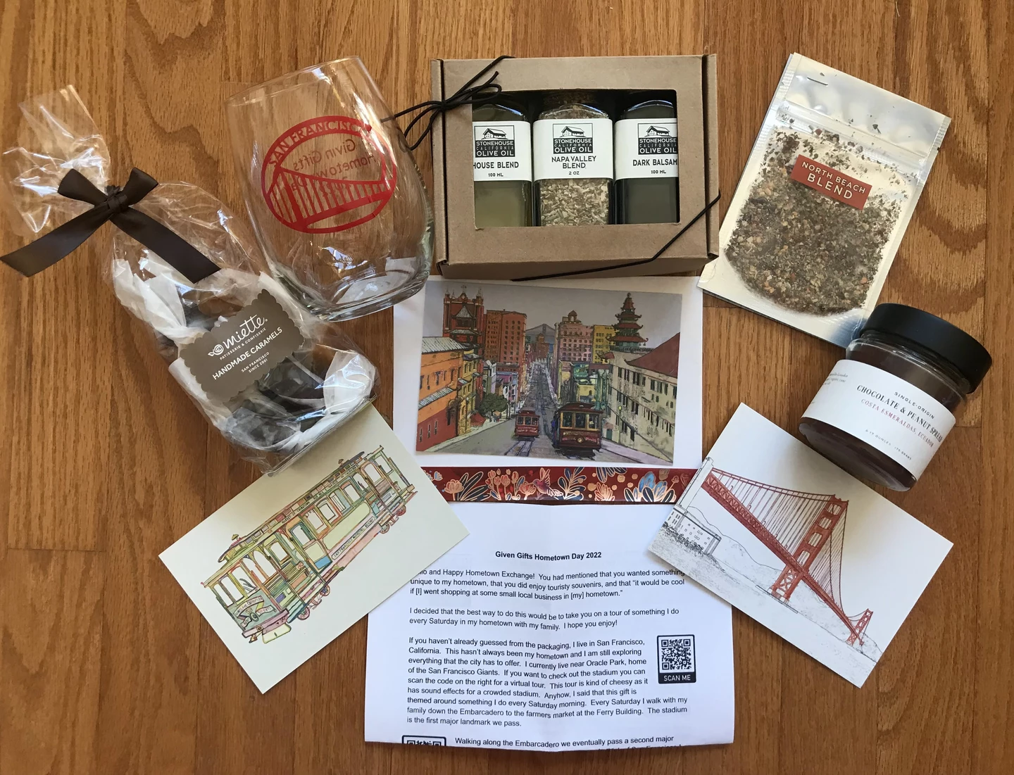 Regarding all the goodies, they were all fantastic! I really appreciated getting items from local businesses that were also touristy & unique. As someone who participates in sending/receiving cards on r/RandomActsofCards, the postcards were such a delight to receive. I'm excited to try all the food-related items. I only have tried the caramels so far and I had to resist finishing all of them in one sitting (then again, my partner and my sister also did a taste test with me). And I love wine glass commemorating this exchange (no worries with it not being perfect because I also struggle to put vinyl on such. haha).