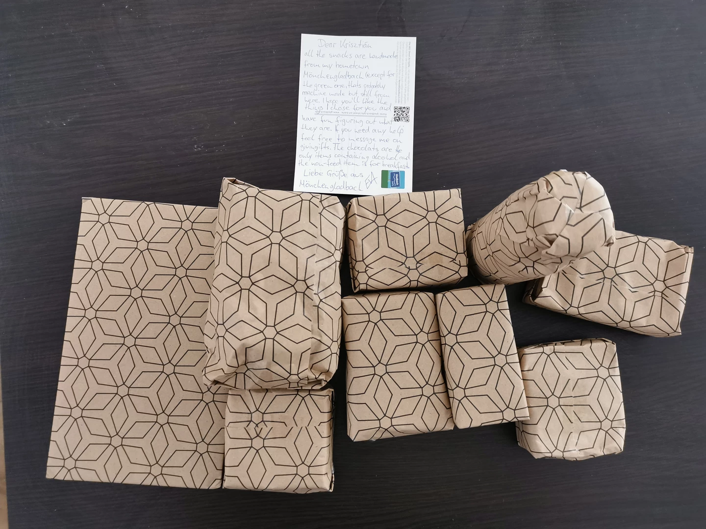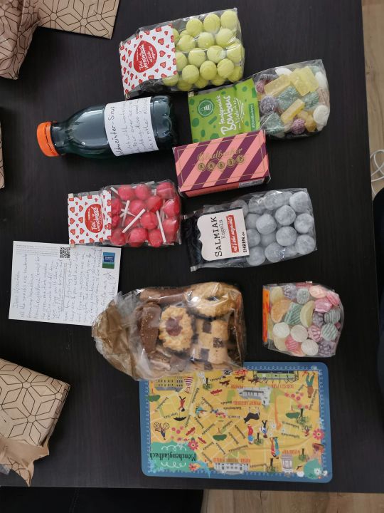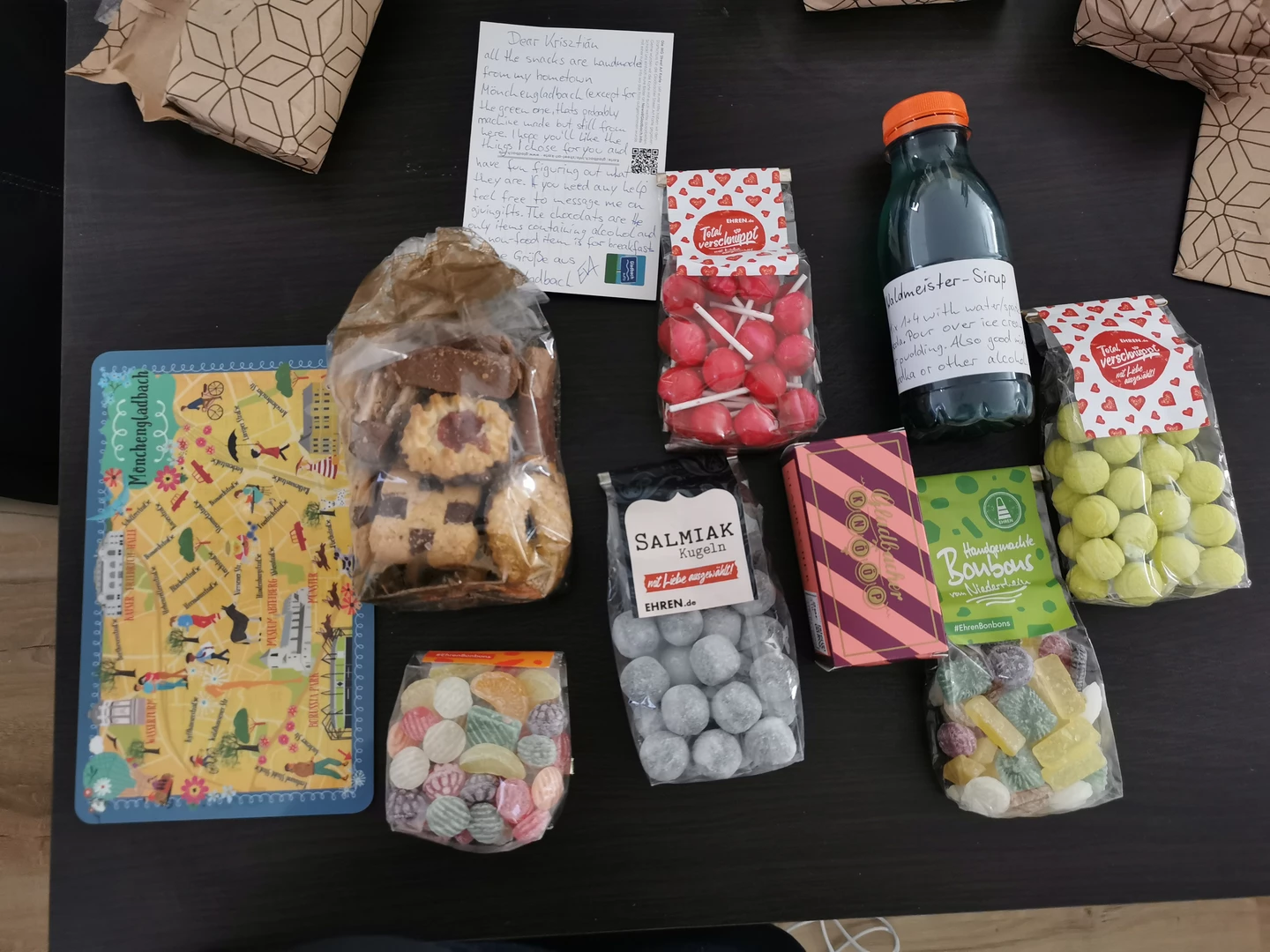 My German gifter got me a nice pack of local handmade sweets from her hometown. They look pretty delicious, can't wait to try them all. I also received a non-food item, which is a breakfast tray(?). I'm not sure what's the right expression for it. Anyway, it's a map of the city with a really nice graphic, I love it.