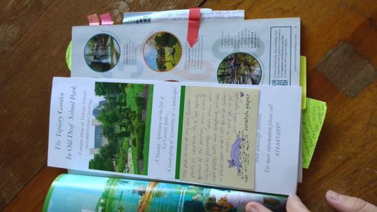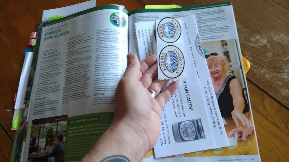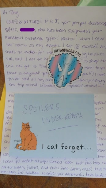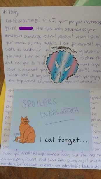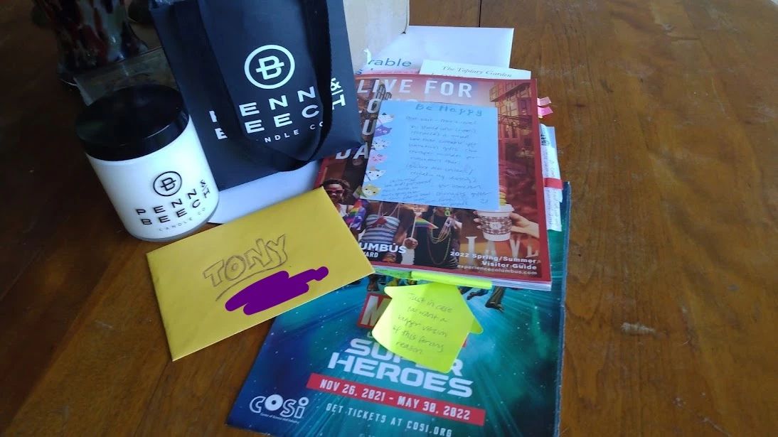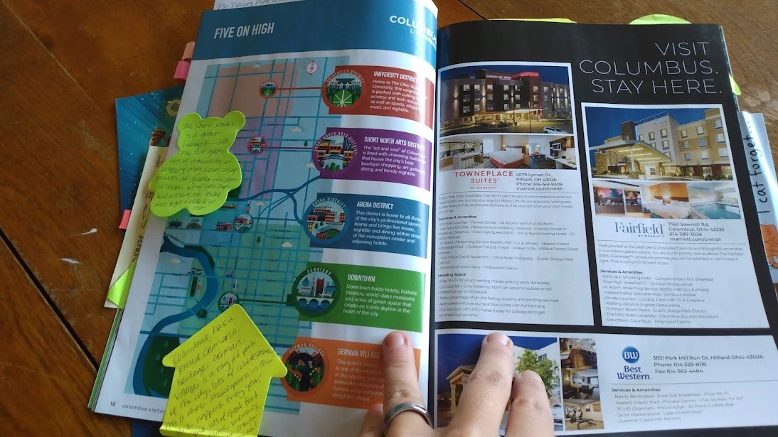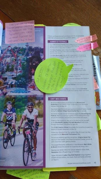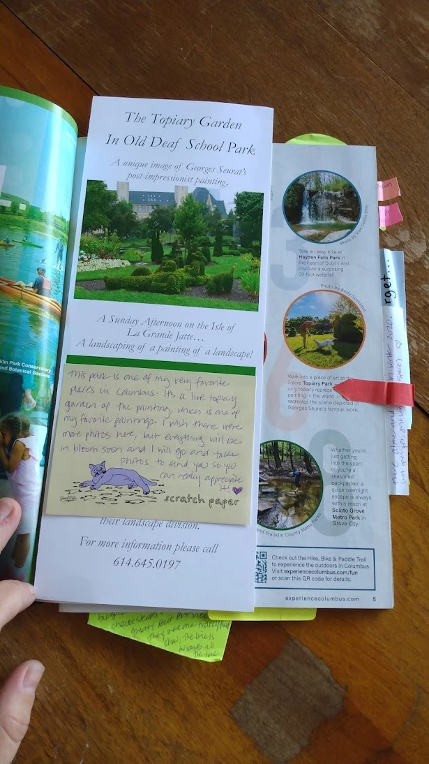 The delayed package was a visitor's guide for Columbus, and my gifter had made it into a personalized scrapbook for me. It was incredibly fun to look through and see all their notes about various attractions, and the brochures, stickers, and postcards they included.