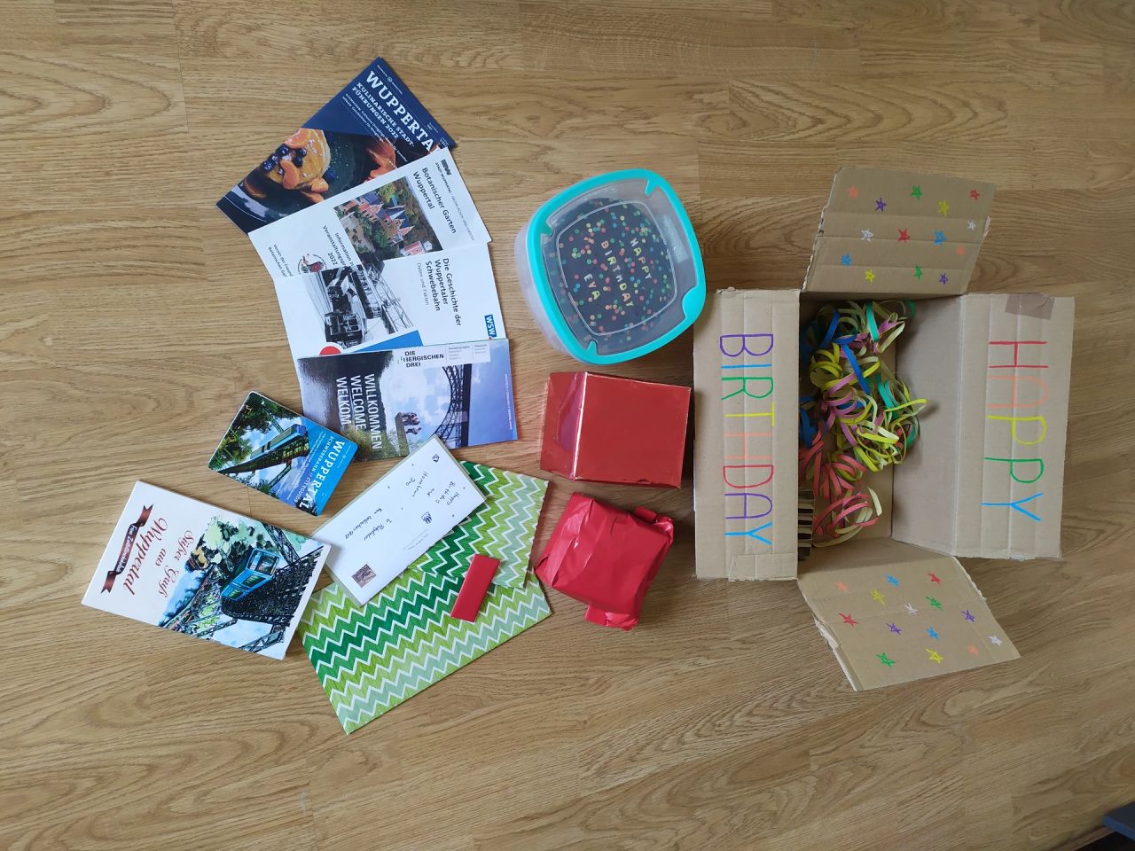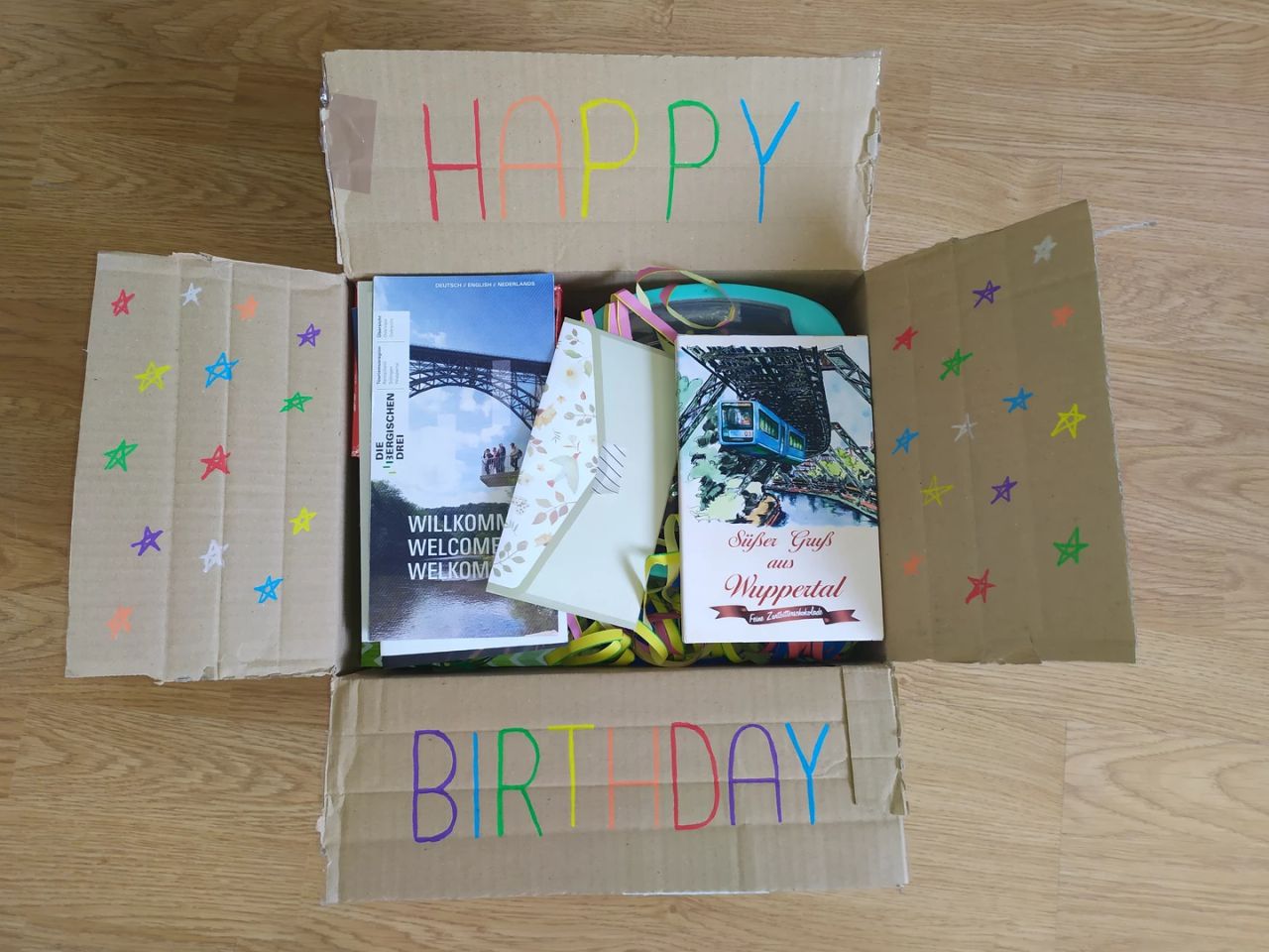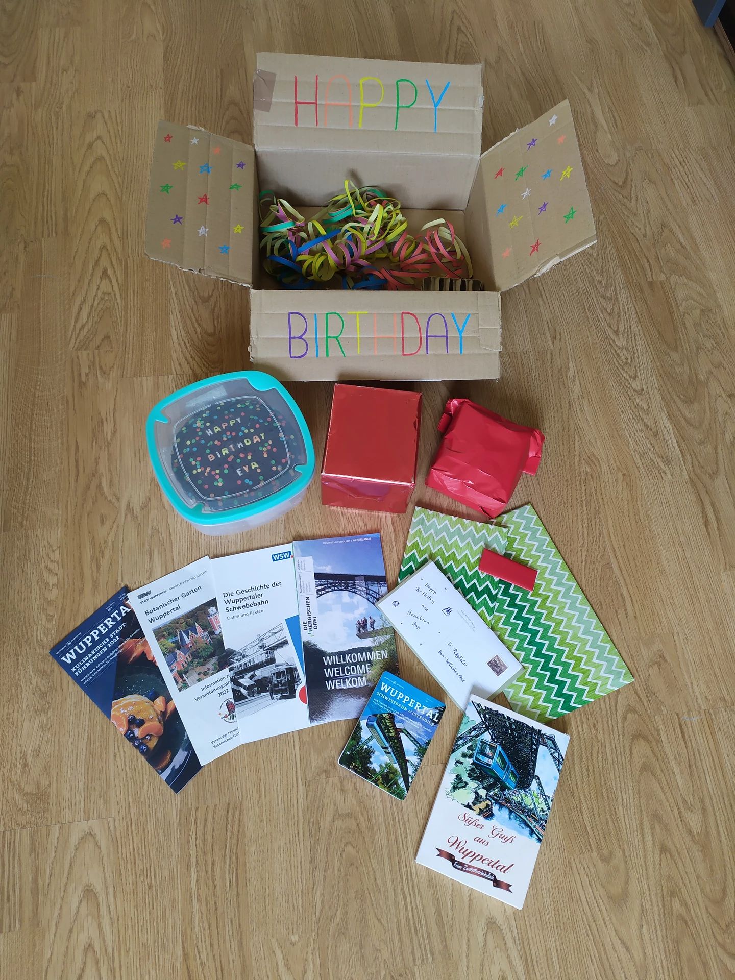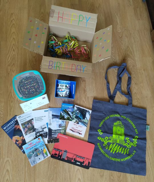 My gifter got me a little of everything Wuppertal. Some brochures about interesting things in their home town, a magnetic bookmark with the famous "Schwebebahn" (suspension railway) on it, a city mug, a skyline breakfast board, a shopping bag from the city's botanical garden made of recycled cotton and WITH LONG HANDLES (wich are the best handles to be!), some dark chocolate, a handwritten letter with two delicious sounding recipes, a little story booklet about the time when a circus elephant took the city's suspension railway and fell out and an awesome birthday cake on top of all this ? All of this arrived in a rainbow colours painted box ?❤️