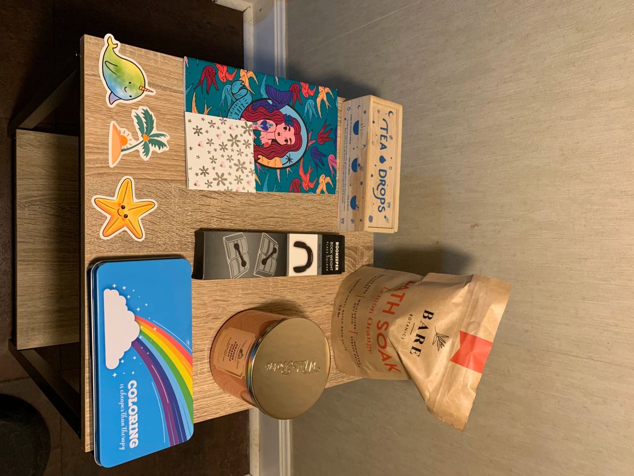 Thank you so much for the thoughtful gifts! I have never tried tea drops before but I’m super excited to try them. The gifter nailed the bath soak and cancel scents, fast new favs. The beachy stickers and coloring book were right on point. Never knew I needed a book weight but yes! Save my thumbs while I wrestle a book down trying to eat and read at the same time. ??I loved this gift. It made me smile. I am so grateful for you! ?