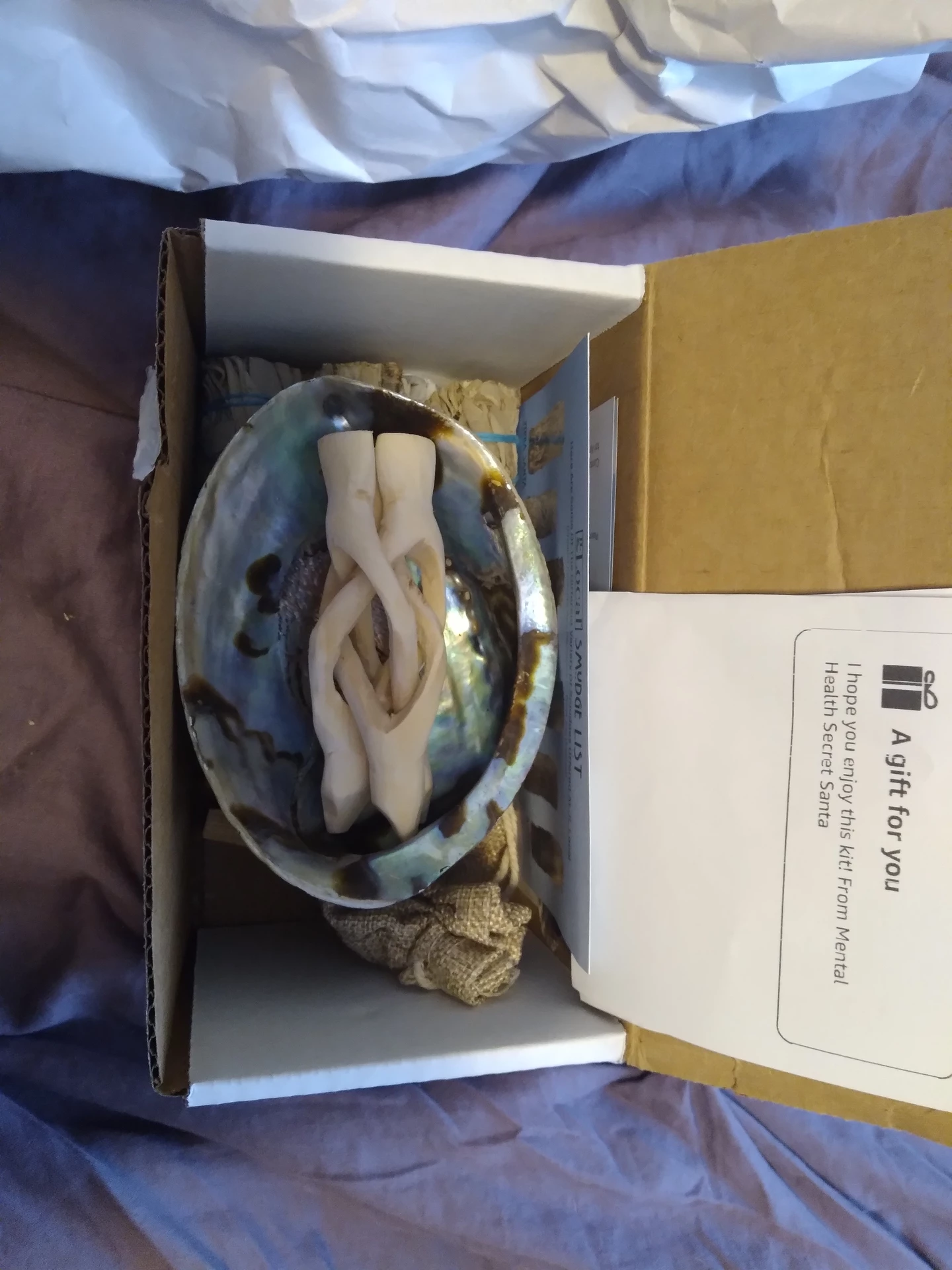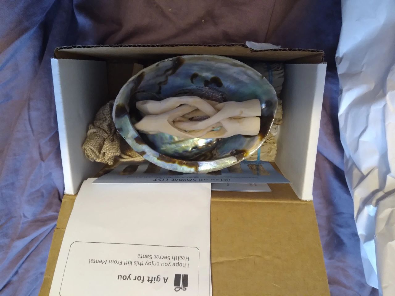 It's a smudge gift set that includes an abalone shell, Palo Santo wood, 3 sage bundles and some chakra stones, and feather. I wanted to add how much I love this gift. It was off of my wish list and it's the perfect gift. I'm now able to smudge, and get all the amazing benefits.