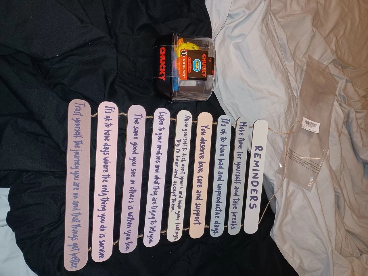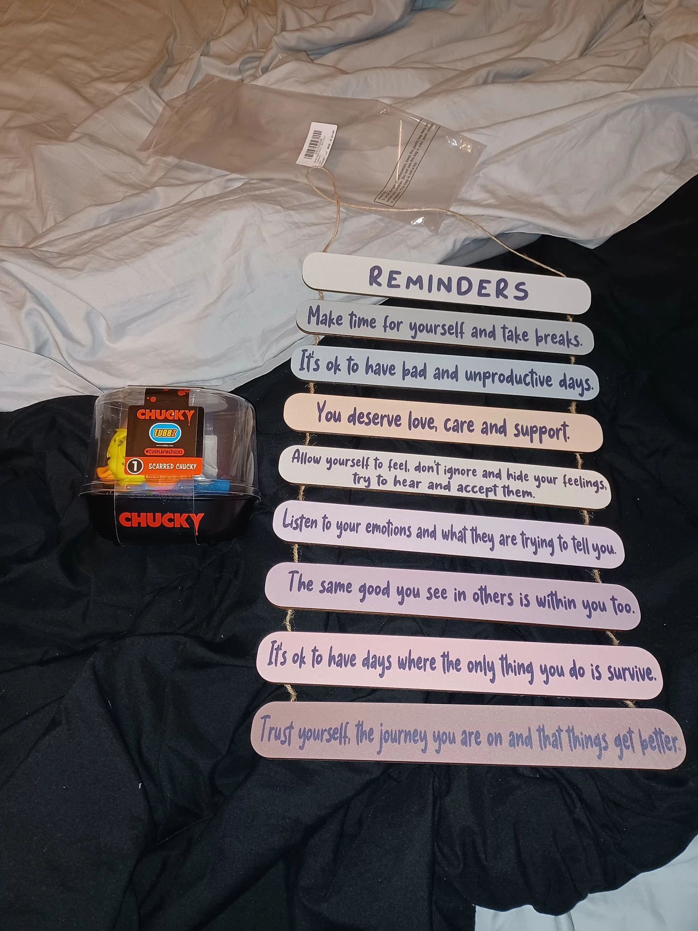 I got a wall hanging with wonderful reminders.. that I admit i need and a Rubber ducky that looks like Chucky. It's a Chucky Ducky. It is fantastic!
