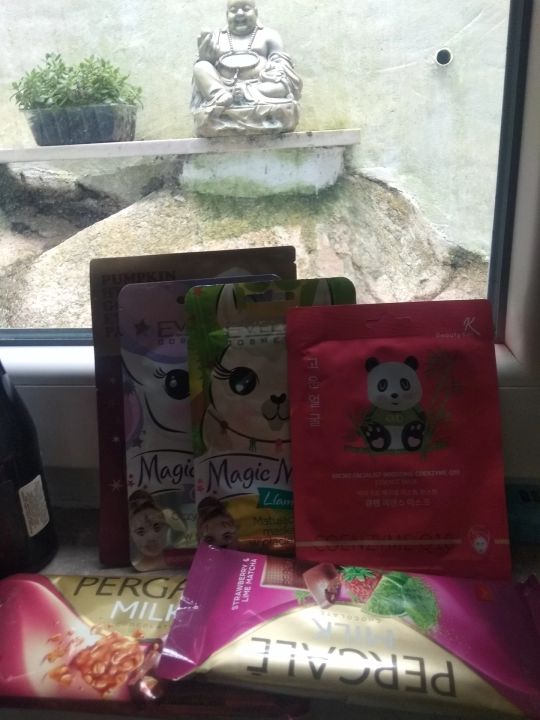 What a lovely surprise! 2 interesting candles that smell amazing, 2 never tried before chocolates, 4 face masks! yes, 4! and to top it up Pomegranate sparkling wine! Saturday will definitely be home spa drinking wine time for sure