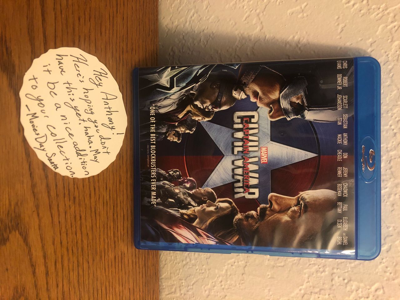 Movie Day Santa sent me captain America civil war on bluray. I haven’t seen it yet so I’m excited to watch it tonight. Thank you for the kind note and movie!!