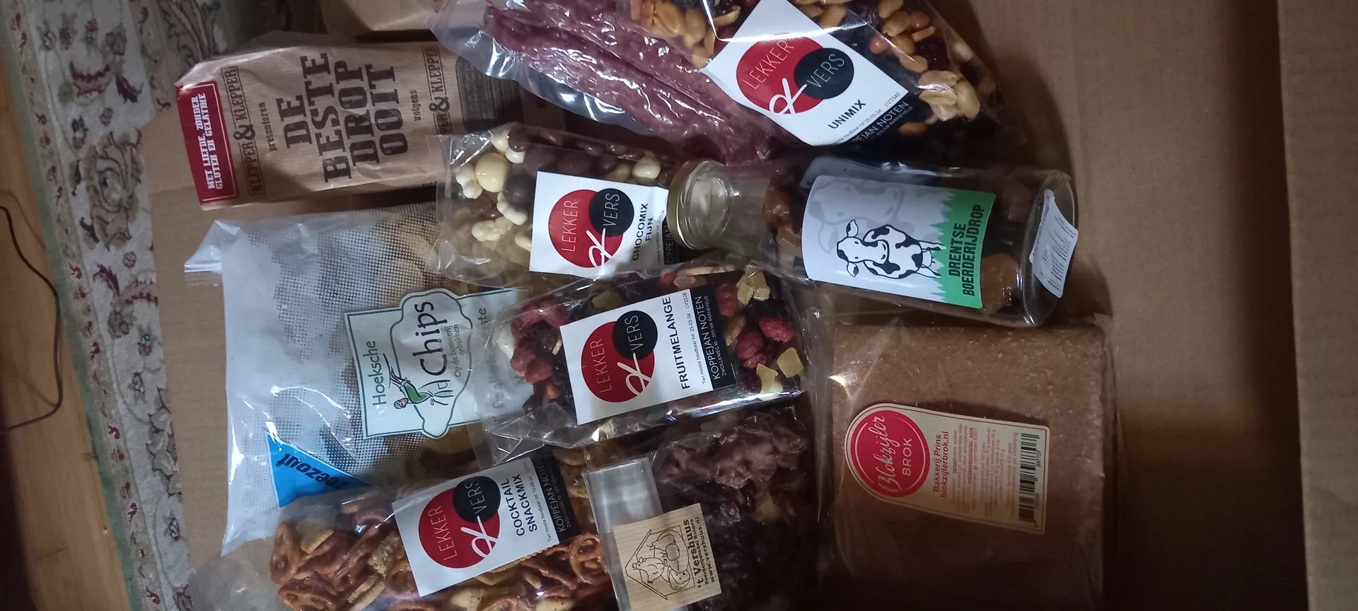 Yeah, Snack Santa got me a box of wonderful assortiment of local goodies. Sweets, Salties. Chocolate. I especially like the square cookie. I'd never seen these before. It's always wonderful to be introduced to new snacks. My son realy loved the dried fruits. My daughter's favorite were the bottled dropjes. Thank you very much, Santa. You chose well.