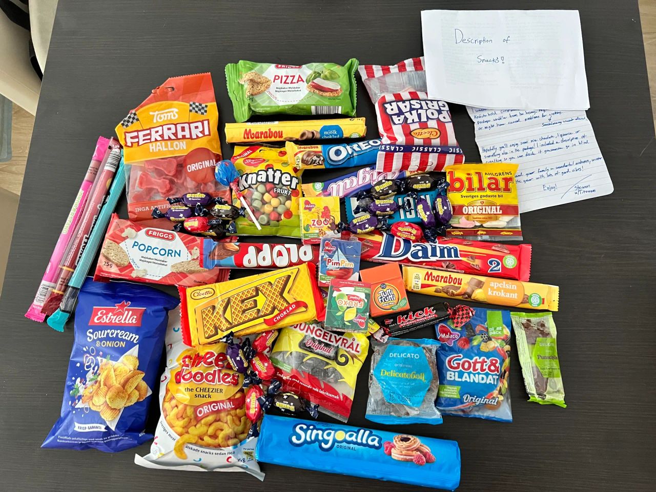 I received a huge box of savoury and salty delights from Sweden. Even though my Gifter couldn’t mail rotten fish and the postal services managed to torture the box so much that it must be against the Geneva conventions, I couldn’t be happier! I also received a nice letter and a note that explains about all the stuff! Thank you very much! We’ll enjoy it!